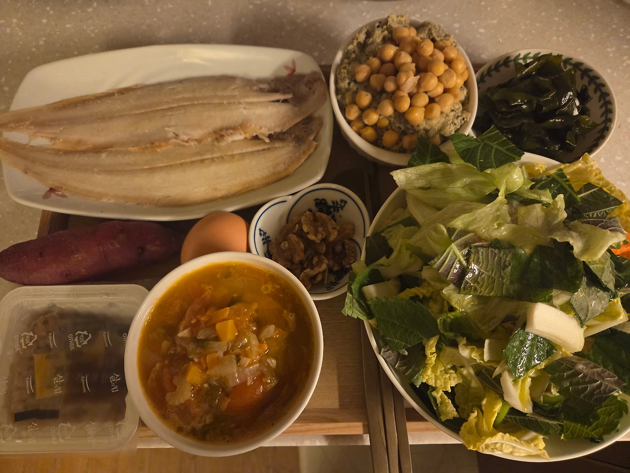 아침에 생채소(배추, 깻잎, 양파, 당근) 샐러드 한 접시 가득을 먹었다. 수분이 많은 아삭한 생채소를 씹는 식감이 좋았다. 낫토는 이제 잘 먹을 수 있지 않을까 재재 재도전을 했다. 첫 입은 머스터드소스 맛에 괜찮았고 두 번째 세 번째 네 번째까지 먹기에 어느 정도는 괜찮았다, 이만하면 잘 먹은 거 같아 나머지는 버렸다. 나머지 한 개는 배고플 때 먹어봐야지.