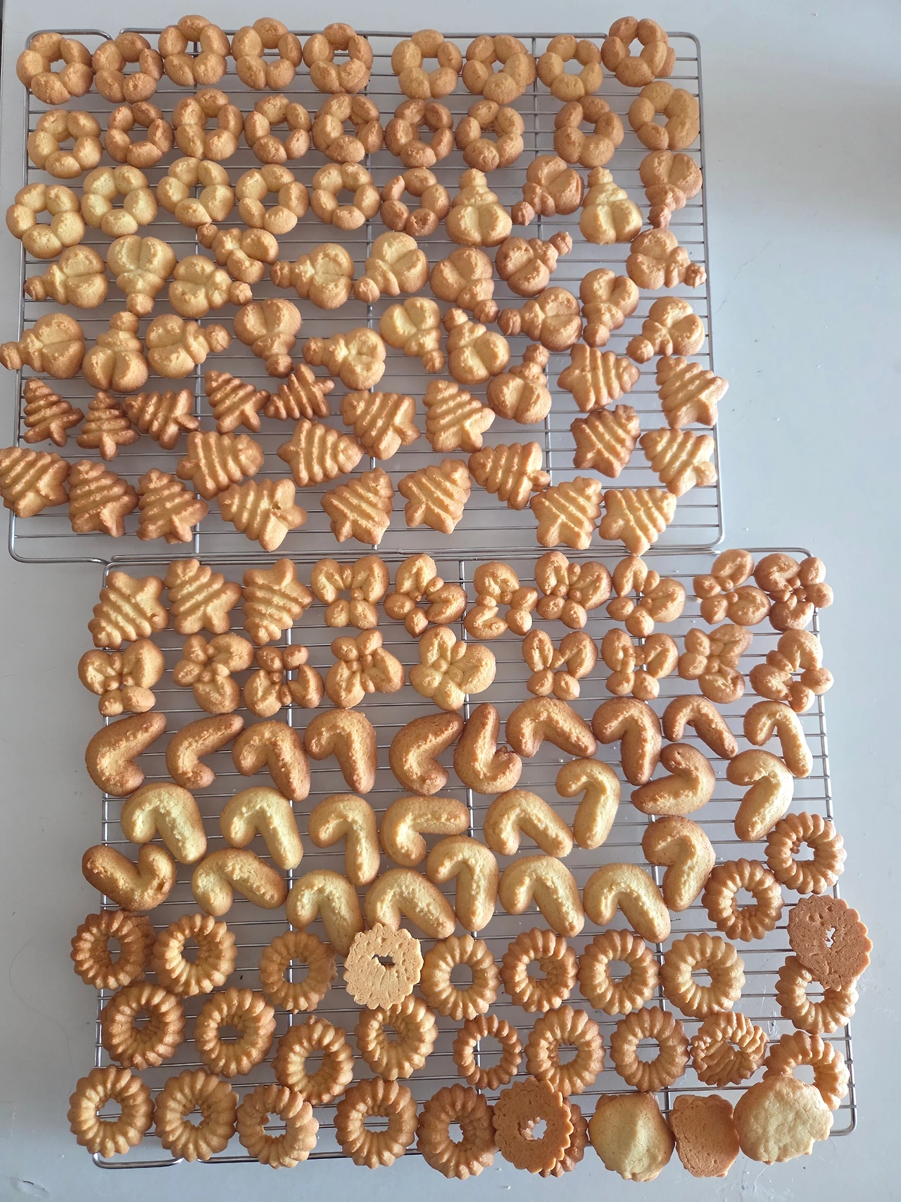 지난번에 만든 프레스쿠키를 2 배합으로 만들었다. 틀도 안사용했던 틀을 사용해 보았다. 트리, 눈사람, 지팡이, 나비. 반죽이 묽어 프레스건으로 쿠키를 짤 때 반죽이 퍼져 나왔다. 반죽이 더 묽었던 이유는 믹서를 더 많이 돌려서거나, 레시피보다 액체양이 많아서거나 둘 중에 하나일 거 같다. 지난번에 계란양이 더 많았어도 반죽되기가 맞고 짤 때도 퍼지지 않았다. 이번에도 괜찮겠다 싶어 더 많았던 계란양을 그대로 넣었다. 차이는 반죽이 가벼운 연노랑색이 될 때까지 핸드 믹서로 더 많이 돌려주었던 거였다. 반죽을 많이 하면 반죽의 되기가 더 질어지고 퍼지는 원인이 되는 거 같다.