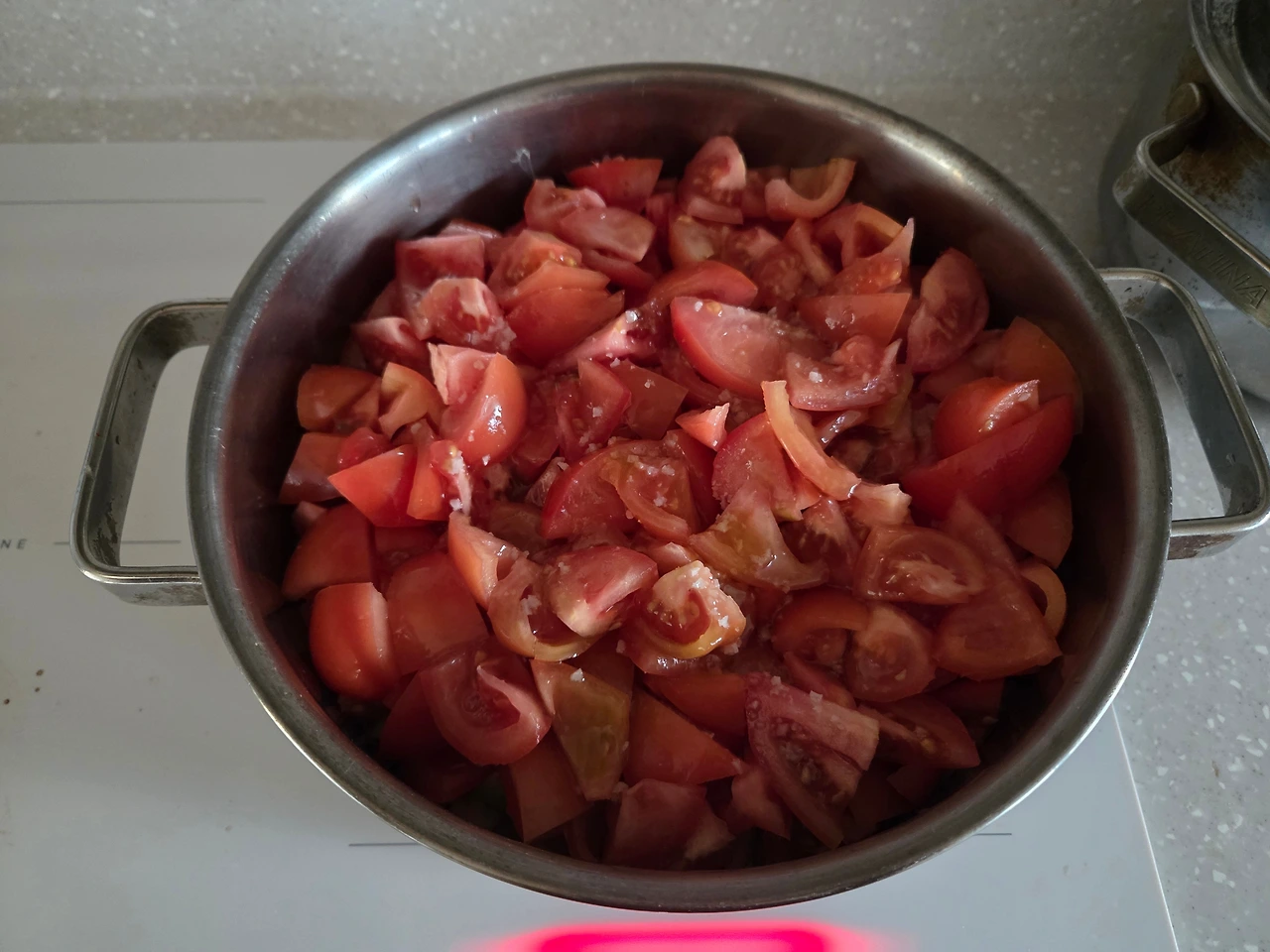 양파, 당근, 셀러리, 무, 마늘을 미리 썰어 놓고 마지막으로 택배로 온 토마토를 썰어 올리고 약불에 뭉근하게 1시간 정도 끓였다. 소금, 재래종 생강가루, 올리브오일 첨가.