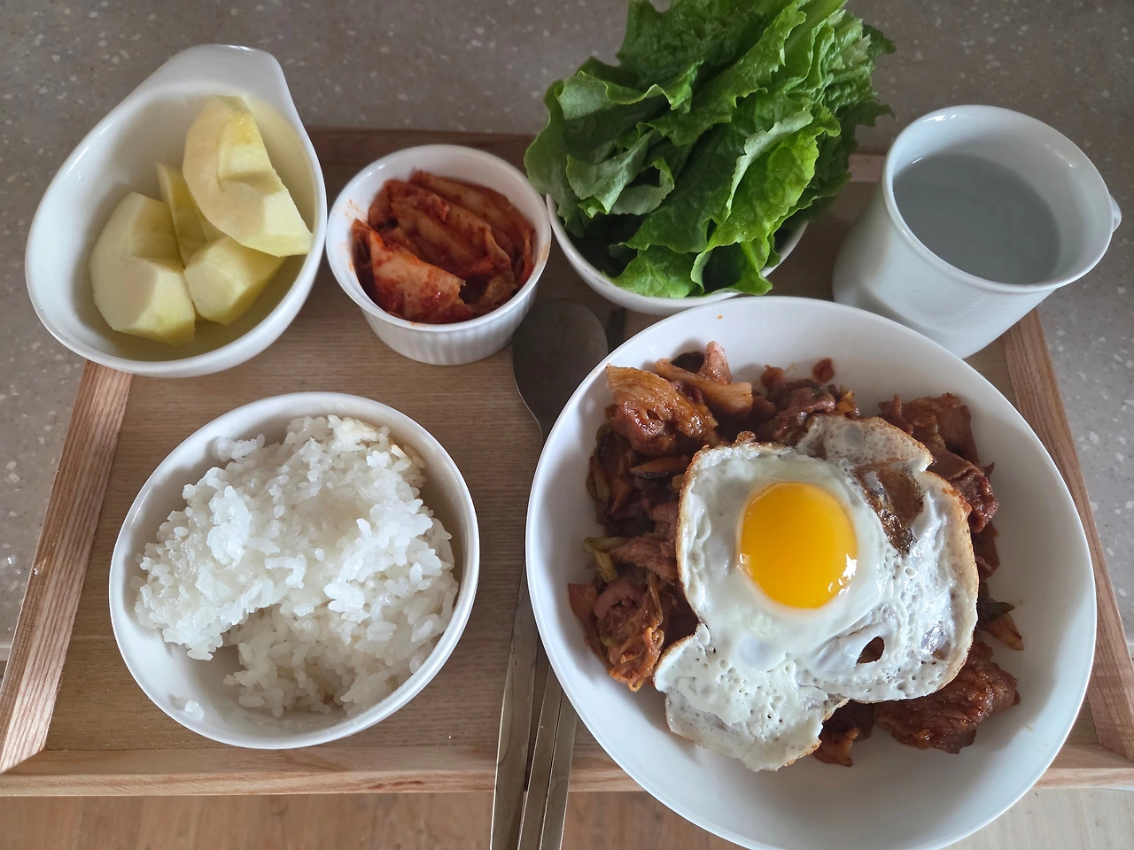 큰아이 점심으로 돼지고기간장볶음, 남겨서 밥과 재료 추가해서 볶아 저녁으로. 한 가지 메뉴로 2끼 해결했다.