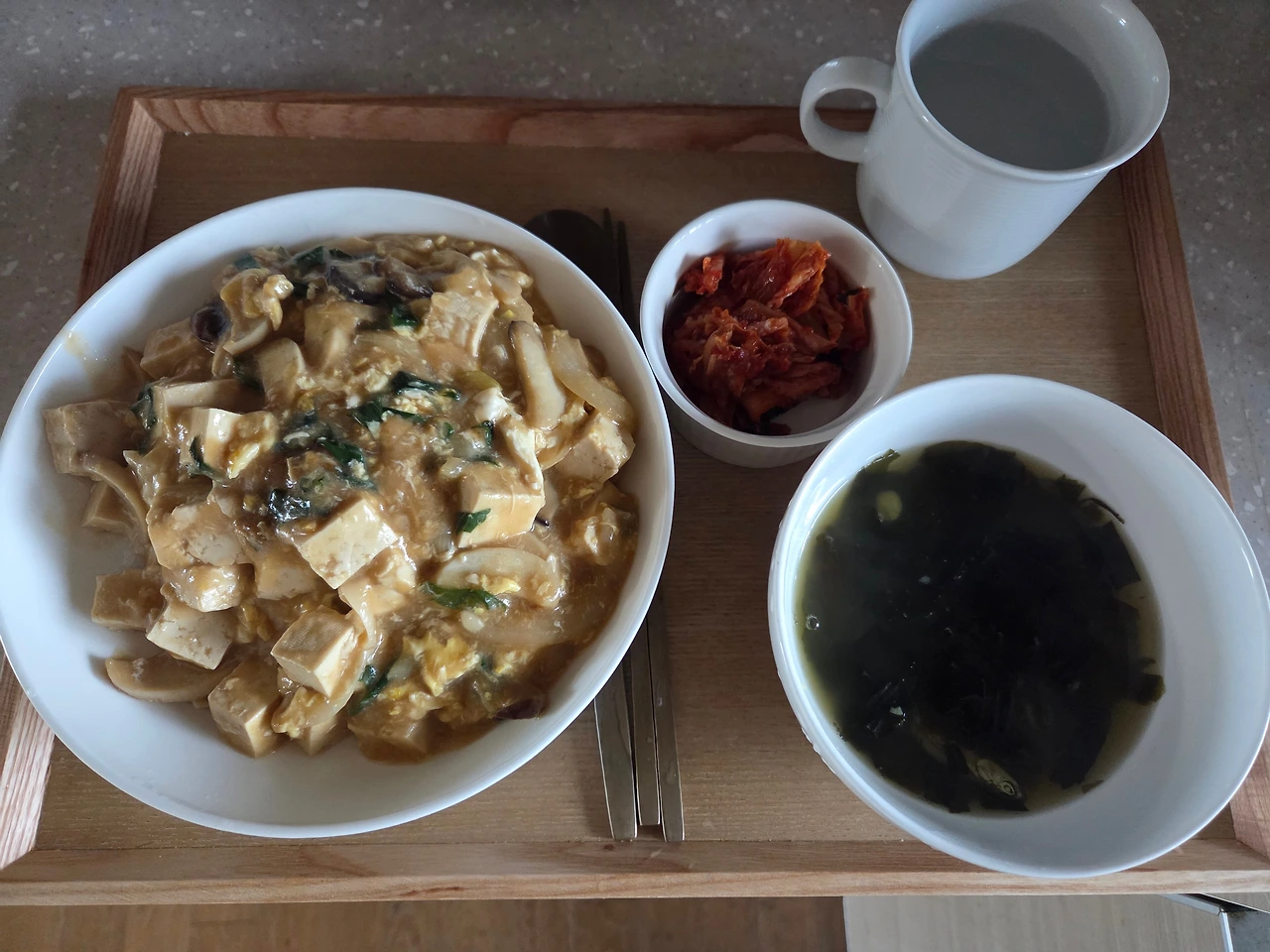 쿠팡에서 산 6구 삼각김밥틀로 삼각김밥 3개를 한 번에 만들었다. 작은아이는 삼각김밥과 주문한 사골국물떡국, 큰아이는 두부버섯덮밥에 미역국.