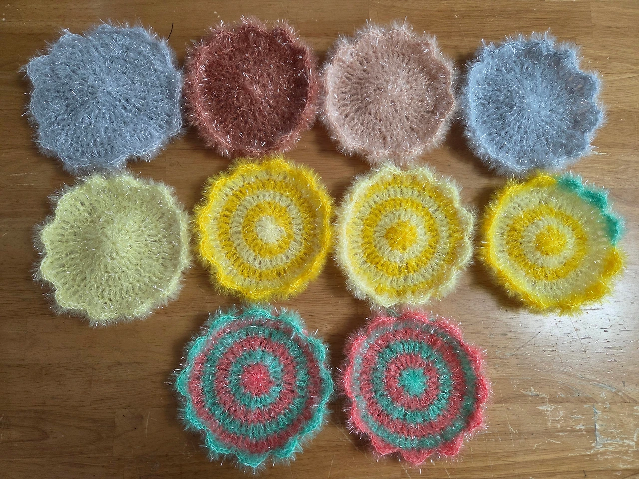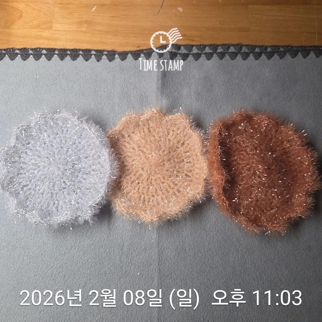 만들어졌을 때의 예쁨보다 만들 때 색실을 사용하는 즐거움이 더 컸다. 선명한 노란색 수세미실 덕분에 수세미를 뜨고 뜨고 또 떴다. 기본 호빵 수세미로 무한정 뜰 것 같던 수세미를 초록과 빨강 수박색 배색 수세미까지 뜨고 멈췄다. 한 개 만들 때 25~30분이 걸리니까 수세미 뜨기만 5시간은 한 거 같다. 시간 가는 줄 모르는 시간이었다.