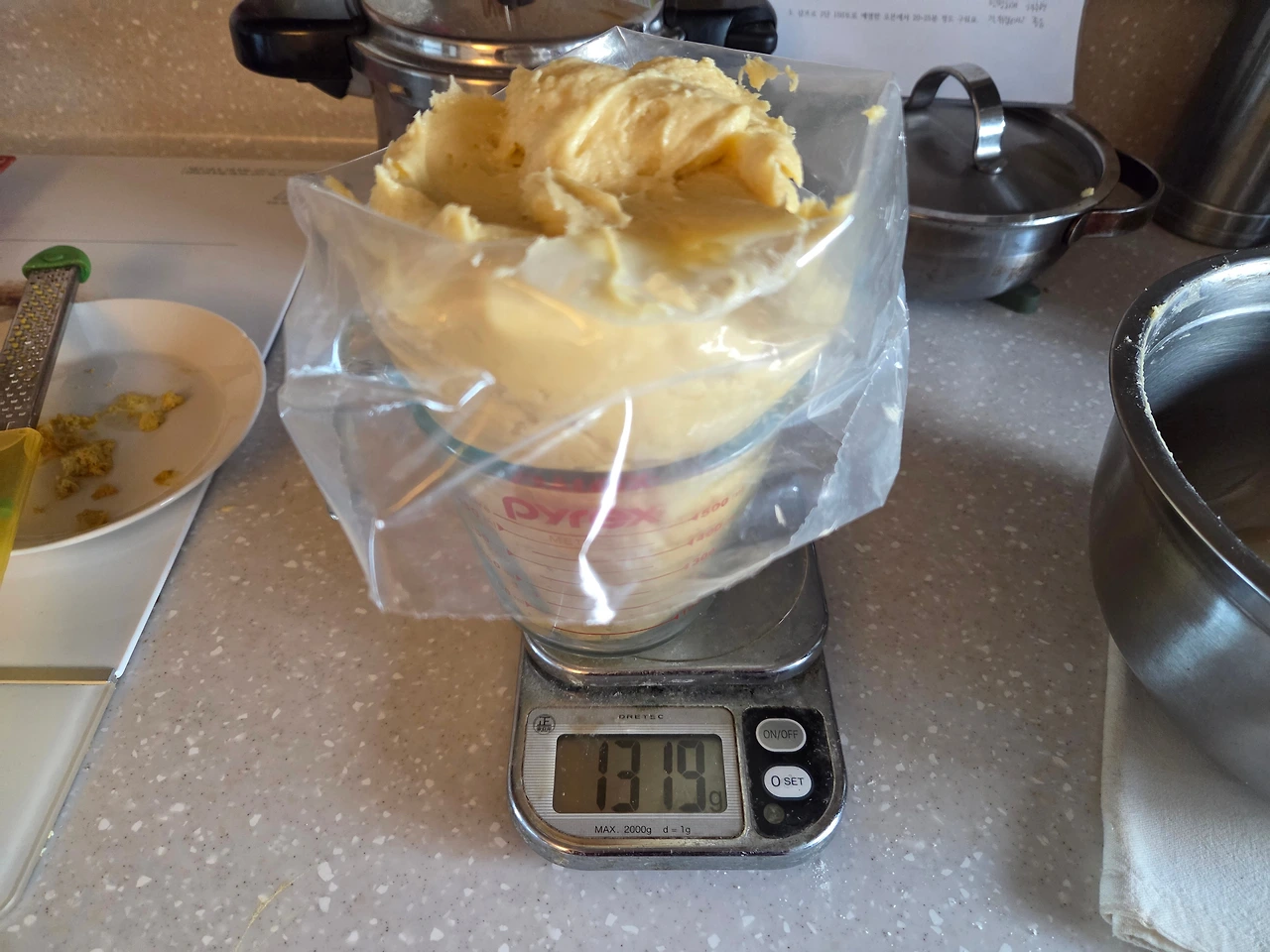 2. 가루를 넣고 섞고, 레몬즙을 2,3번에 나눠 넣는다 (레몬즙은 직접 짜서 사용하고, 레몬껍질을 제스터로 깎아 같이 넣어준다)