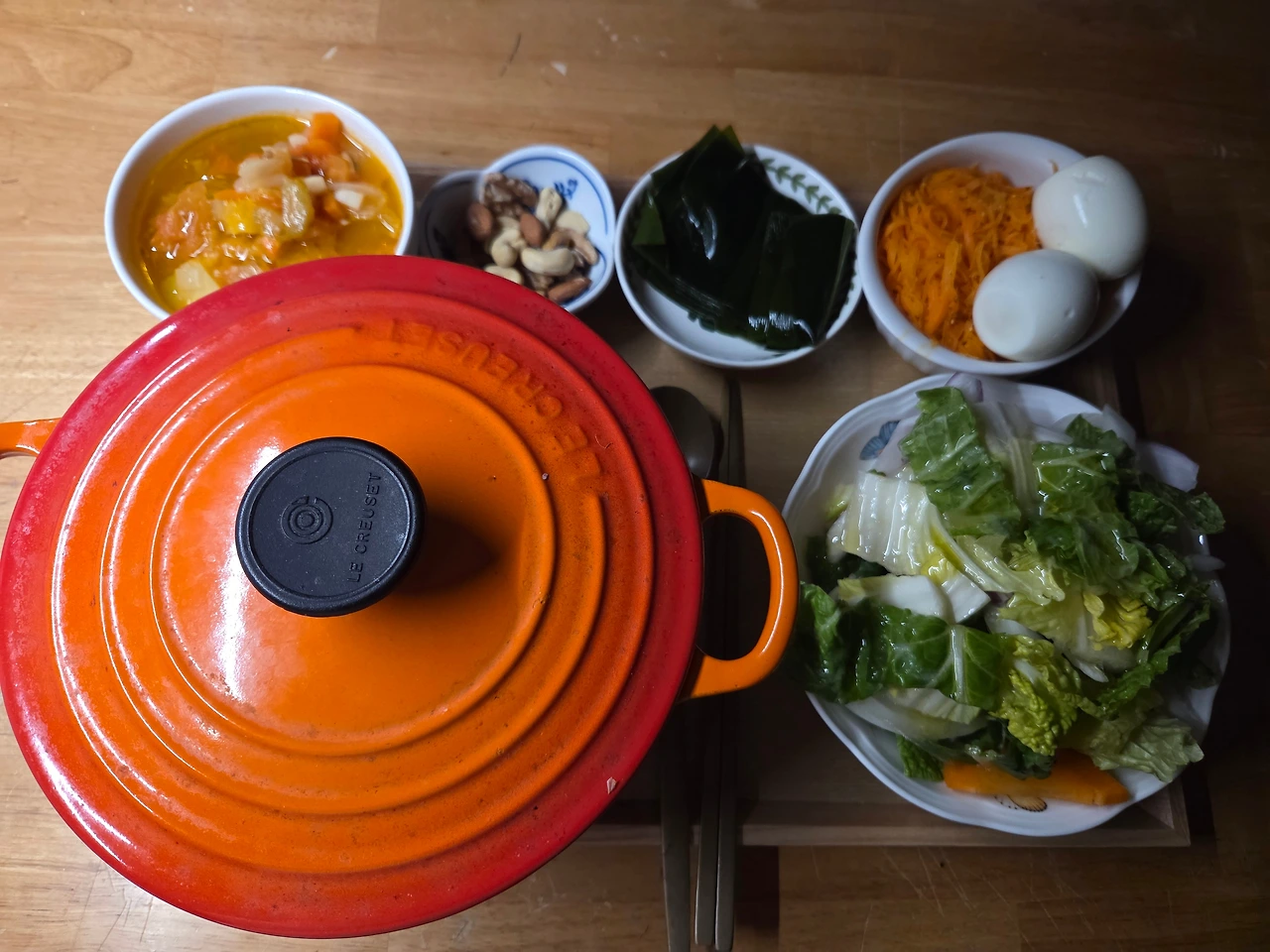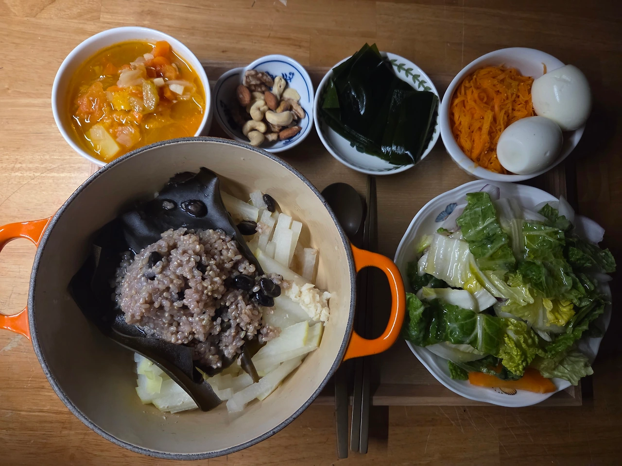 아침에 따뜻한 게 먹고 싶어 무채나물을 만들어 먹었다. 나머지는 다 준비된 재료들. 잘라둔 야채, 삶아둔 계란, 만들어 놓은 당근라페, 손질해 둔 쌈 다시마, 전치리 후 구워둔 견과류들, 만들어 놓은 야채수프. 무채나물이 다 익어갈 때쯤 위에 밥을 올려 데워주었다.