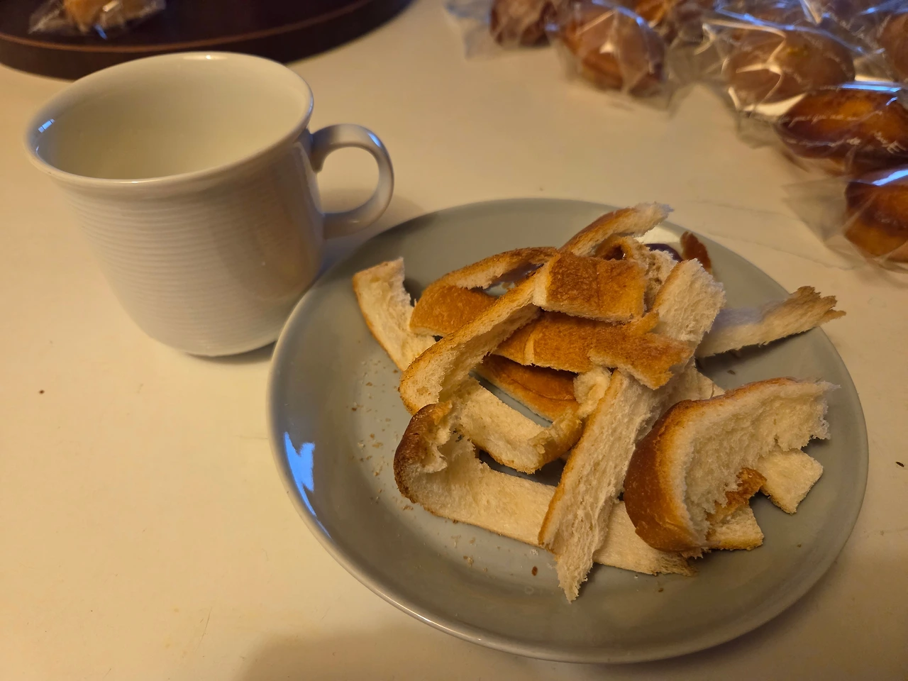 아침에 기분이 안 좋아 다른 게 더 먹고 싶어졌다. 식빵 테두리를 안 좋아하는 아이가 남겨둔 식빵 한 장의 테두리를 먹고 부엌에 있던 식빵 3장의 테두리를 더 잘라 멸균우유에 찍어 먹었다.