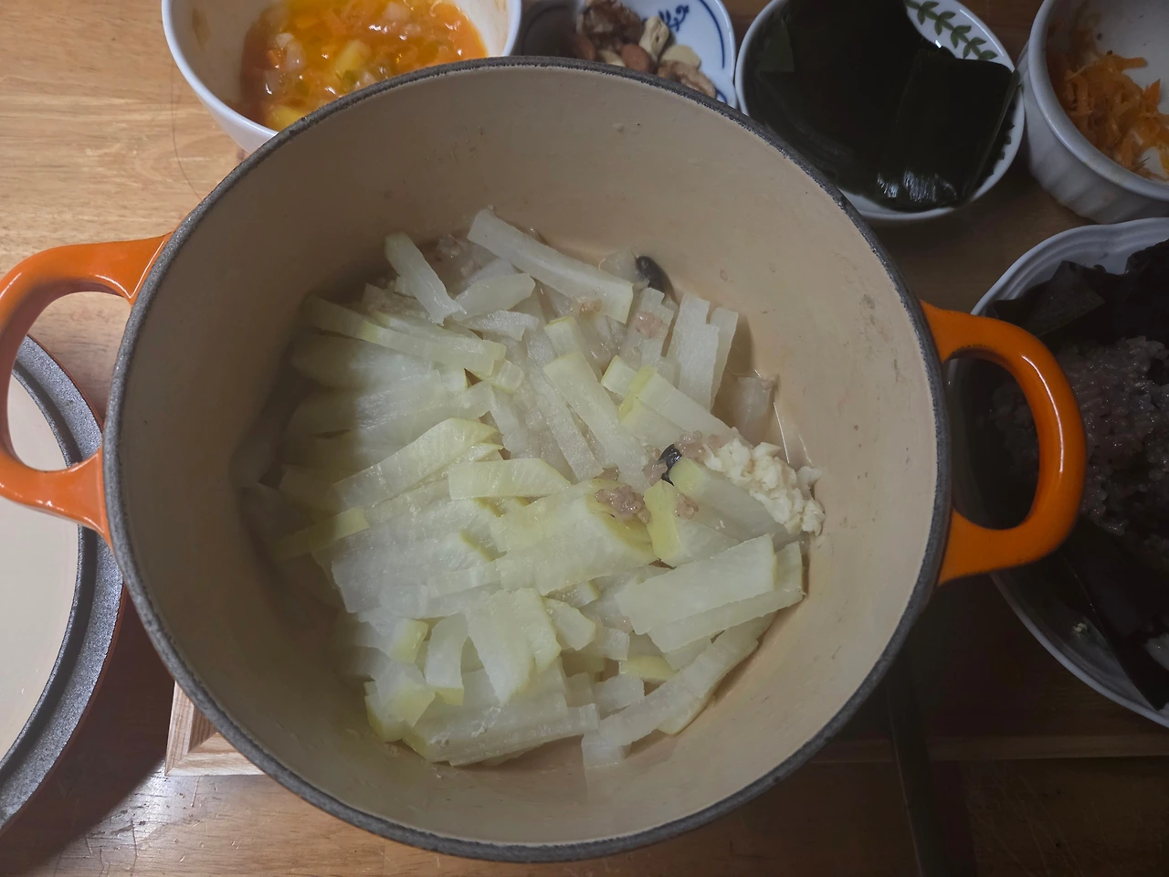 물을 조금 넣고 소금 간하고 다진 마늘을 넣어 저수분으로 중불에서 뭉근히 끓여 만든 무채나물.