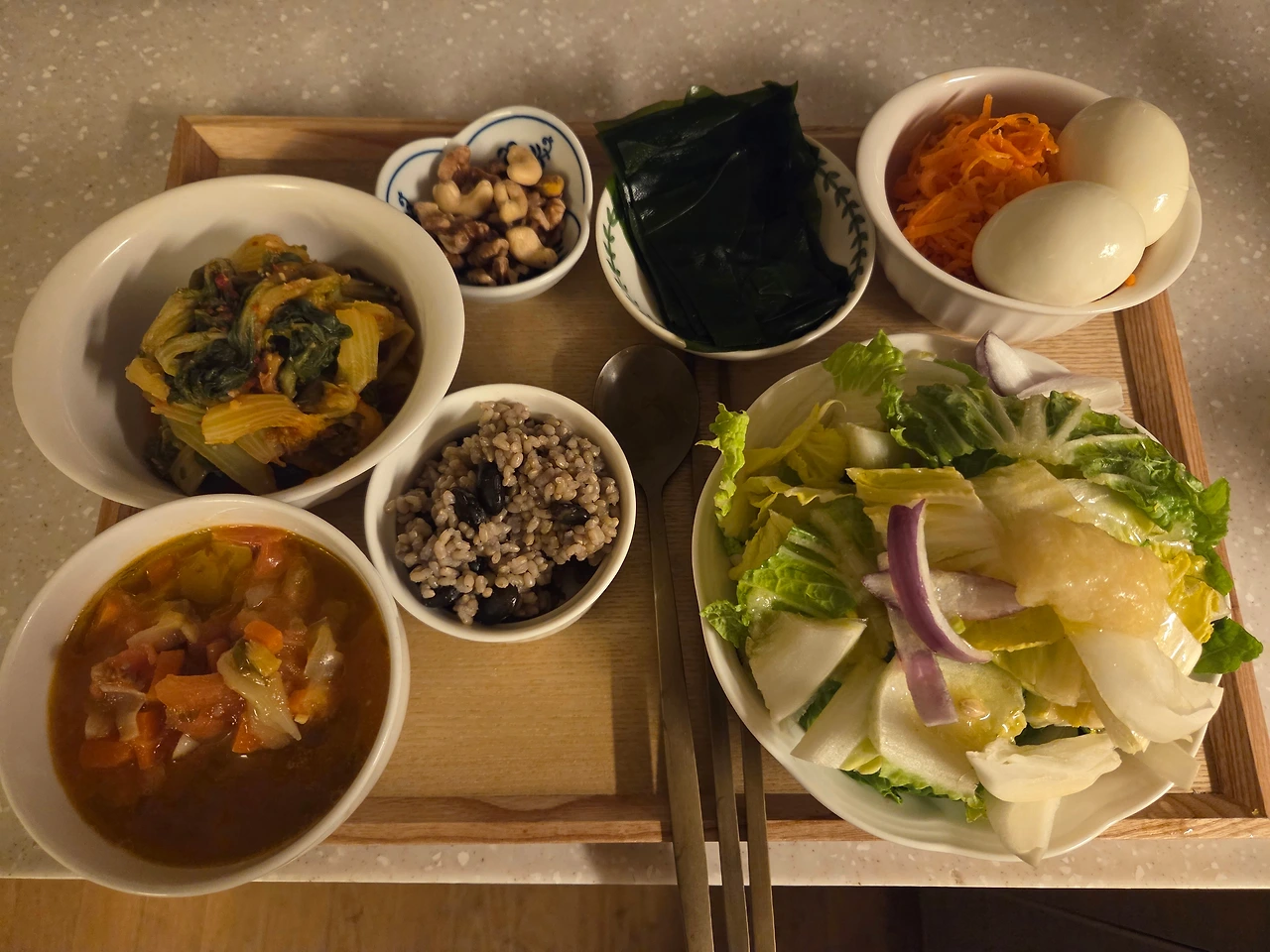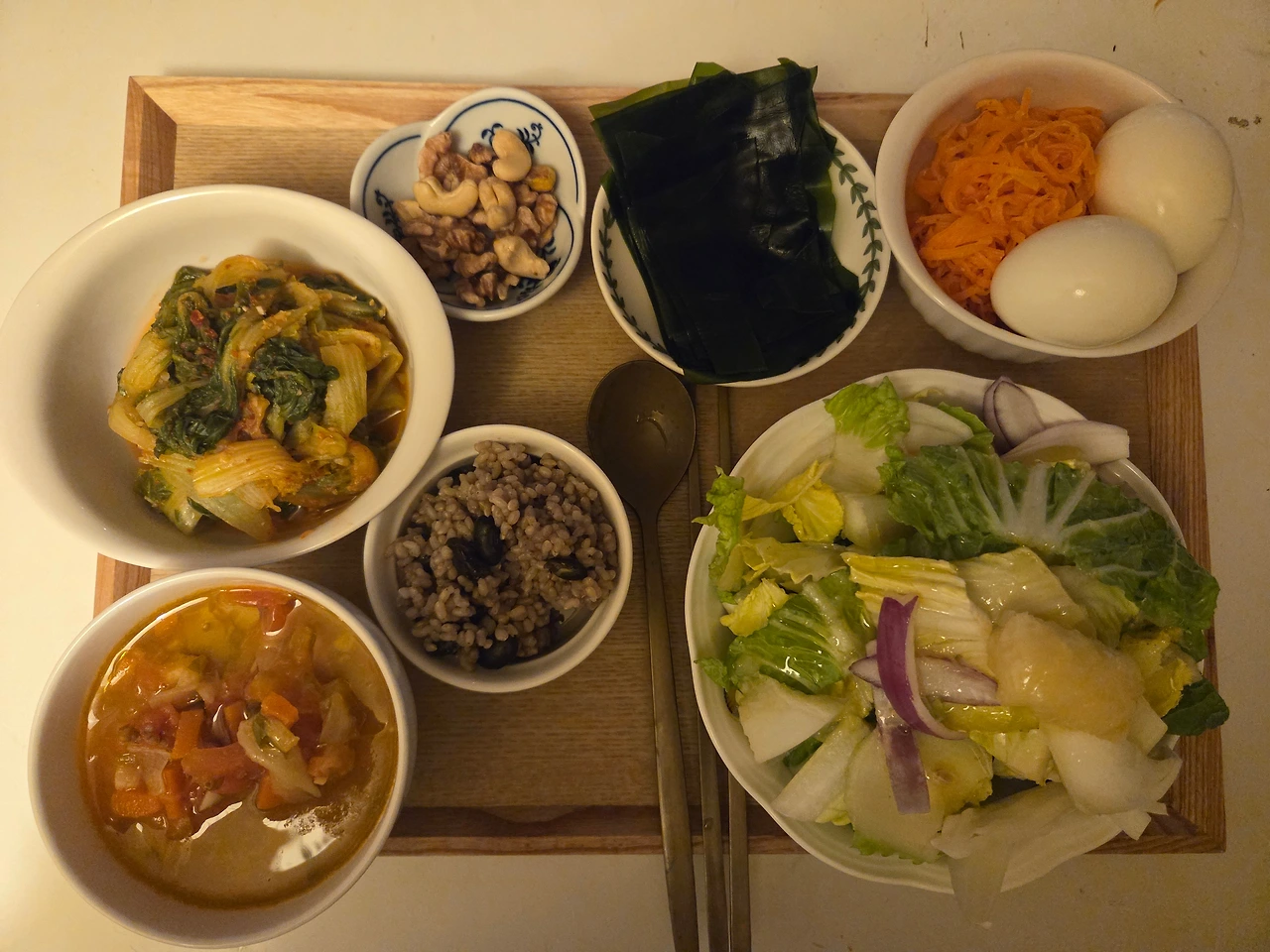 부엌 싱크대 위에서 상 차려 식탁으로 옮겨 찍은 사진. 놓을 공간이 더 넓어 위에서 찍을 수 있다.