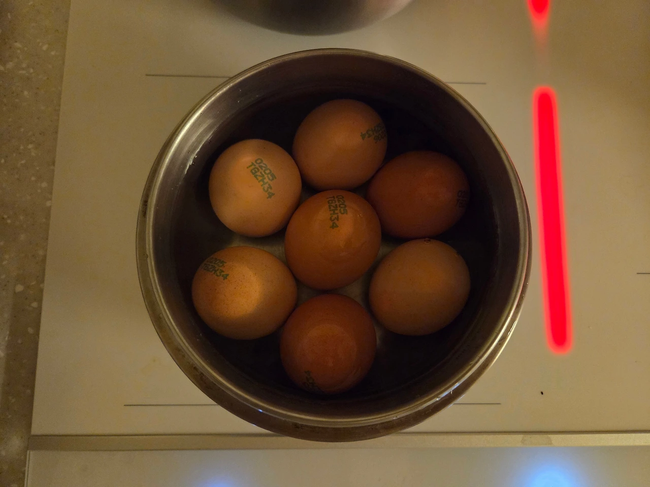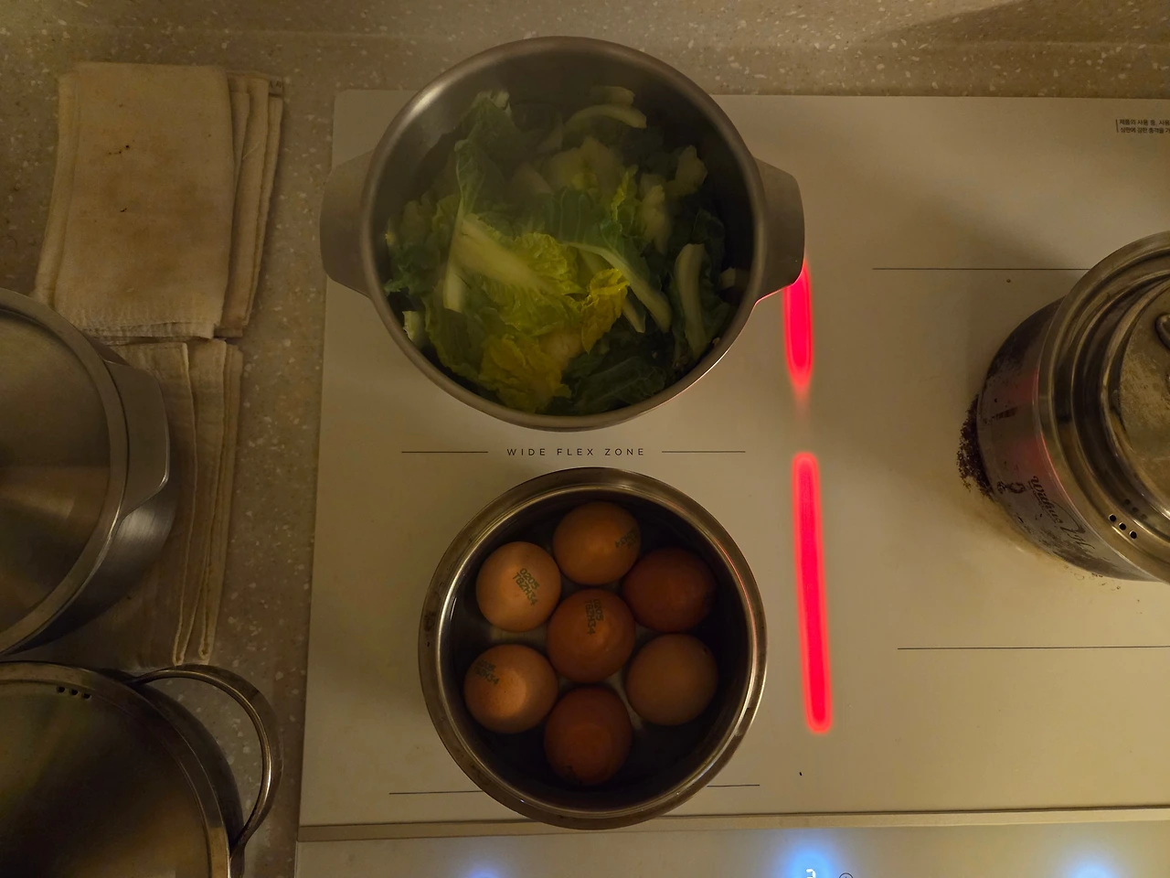 아침밥반찬으로 배추나물, 당근라페와 같이 먹을 삶은 달걀. 삶은 달걀은 냉장고에 있었지만 따뜻한 게 먹고 싶어 새로 삶았다.