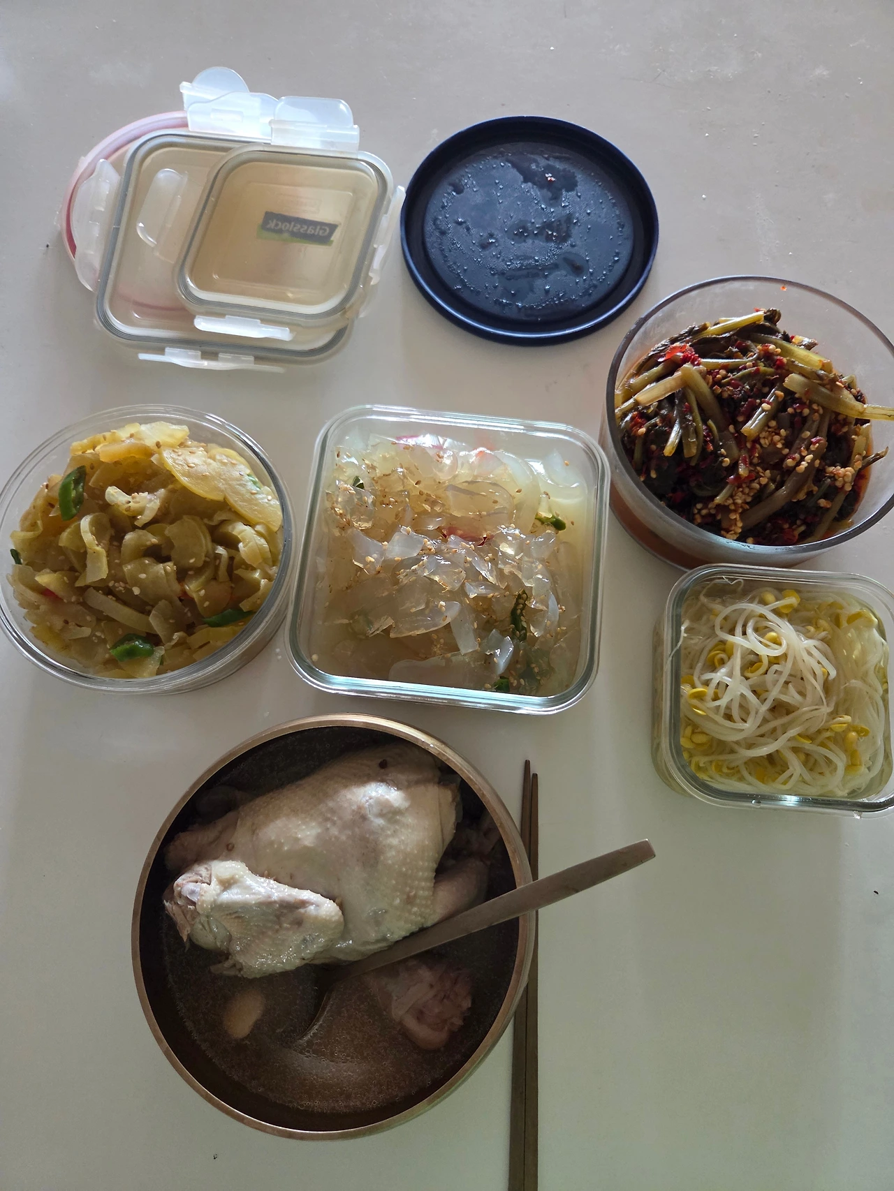 유기그릇에 엄마 삼계탕을 담고 반찬그릇에 담아둔 엄마 반찬들을 꺼내 아침으로 차려 먹었다. 엄마집에 다녀오며 평소보다 아침을 늦게 먹어 시장하기도 했고 내 몫이 없다는 것에 화가 나 삼계탕을 남기지 않고 다 먹었다. 거실에 앉아 티브이를 보는 남편에게 보란 듯이.