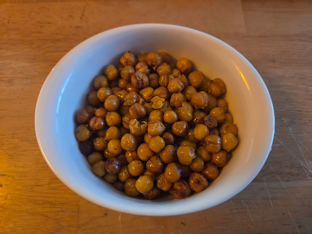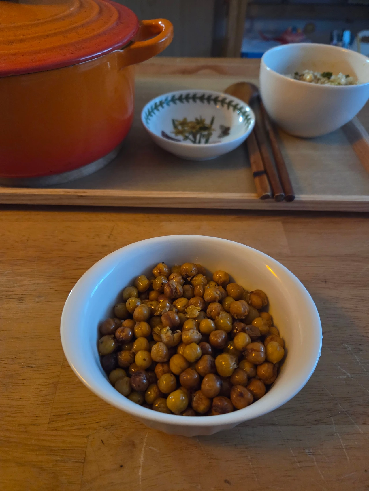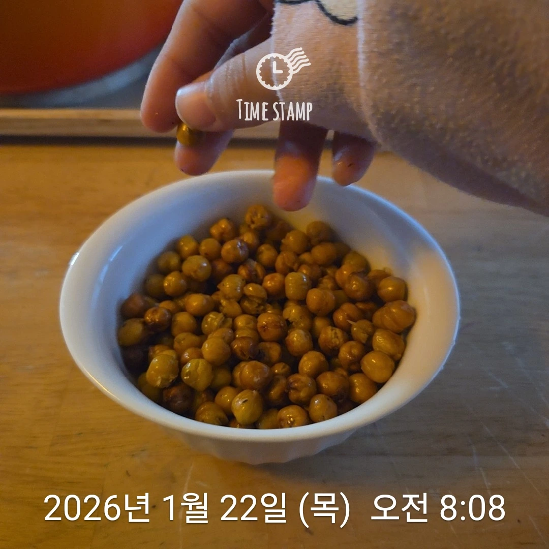 아침에 기록한 데로 오늘은 삶은 병아리콩을 오븐에 구워 먹었다. 바삭한 식감이 좋아 200도로 30분을 구웠더니 크기는 반정도로 줄고 색깔은 선팅을 한 듯 갈색 옷을 입었고 식감은 바사삭 과자식감이 됐다.