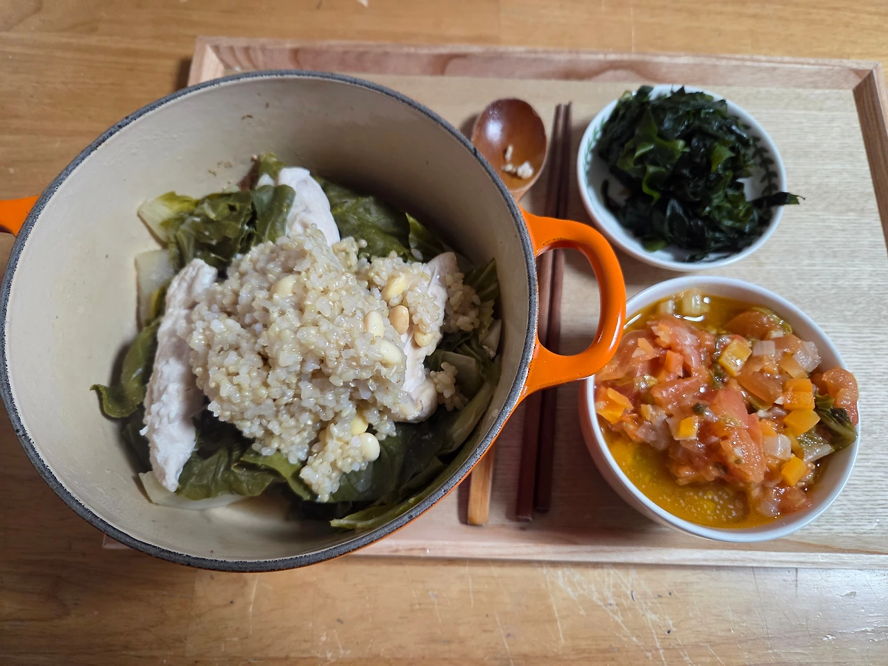 오늘 아침으로는 무 300그람 정도를 크게 썰어 바닥에 깔고 봄동배추 한 다발을 그 위에 놓고 냉동 닭안심 3 덩이를 올리고 저수분으로 끓였다. 그리고 현미밥을 반공기 못되게 올렸다. 간은 된장으로.
