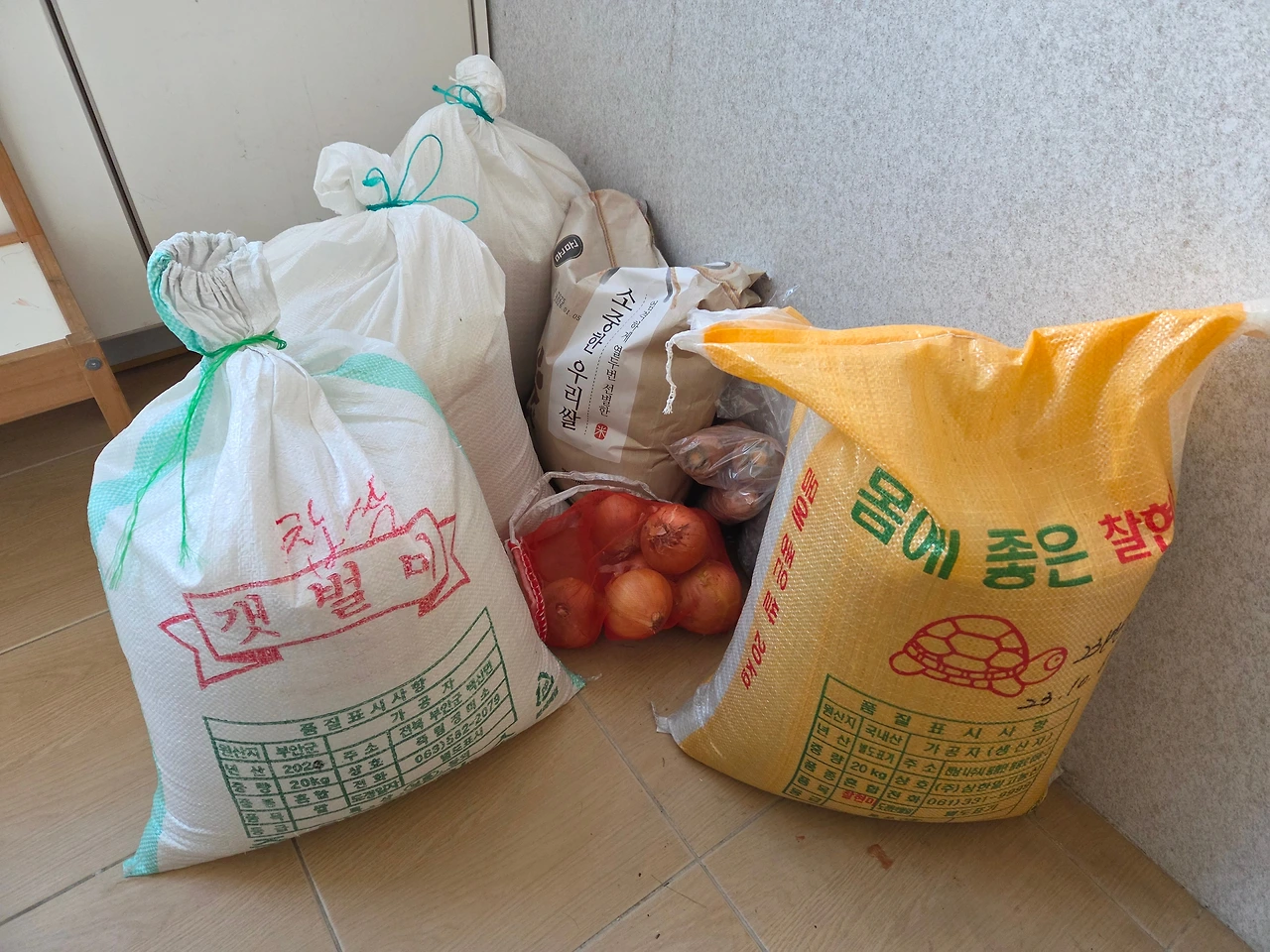 엄마집에서 가져온 쌀 4 가마. 백미 2, 찹쌀 1, 현미 1.