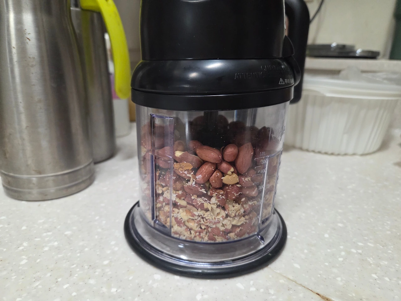농협 마트에서 사 온 국산땅콩을 오븐에서 160도로 20분 구운 후 초퍼로 갈아 땅콩버터를 만들었다.