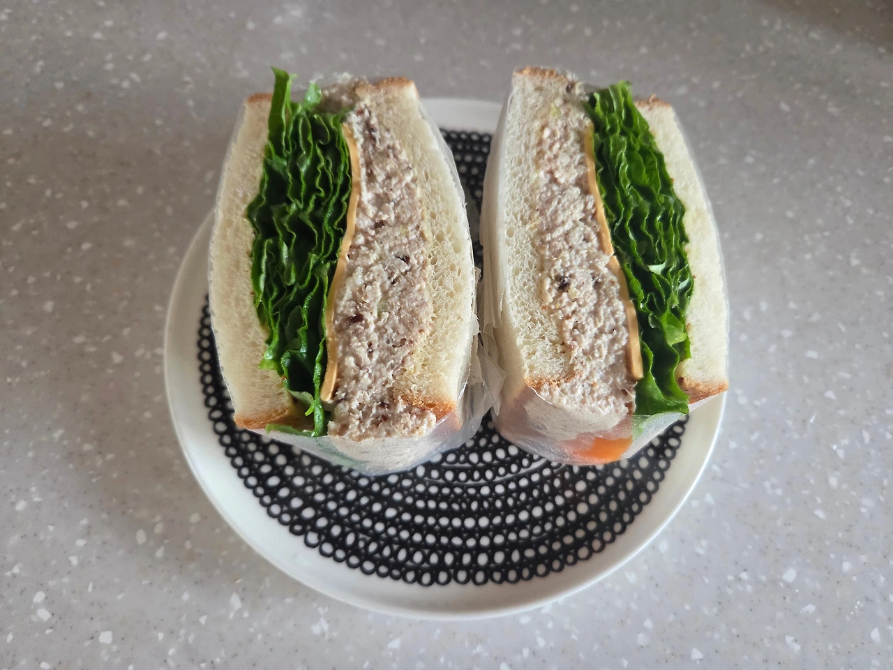 삶은 닭안심 100그람 정도, 양파 1/6개, 호두, 건포도 10그람씩(건크랜베리 대신 집에 있는 건포도로) 초퍼로 다져주고, 그릭요거트, 마요네즈 1큰술씩 넣고 소금, 후추 넣고 섞어 준다. 아이가 맛있다면 또 만들어주고 싶은 심플 샌드위치.