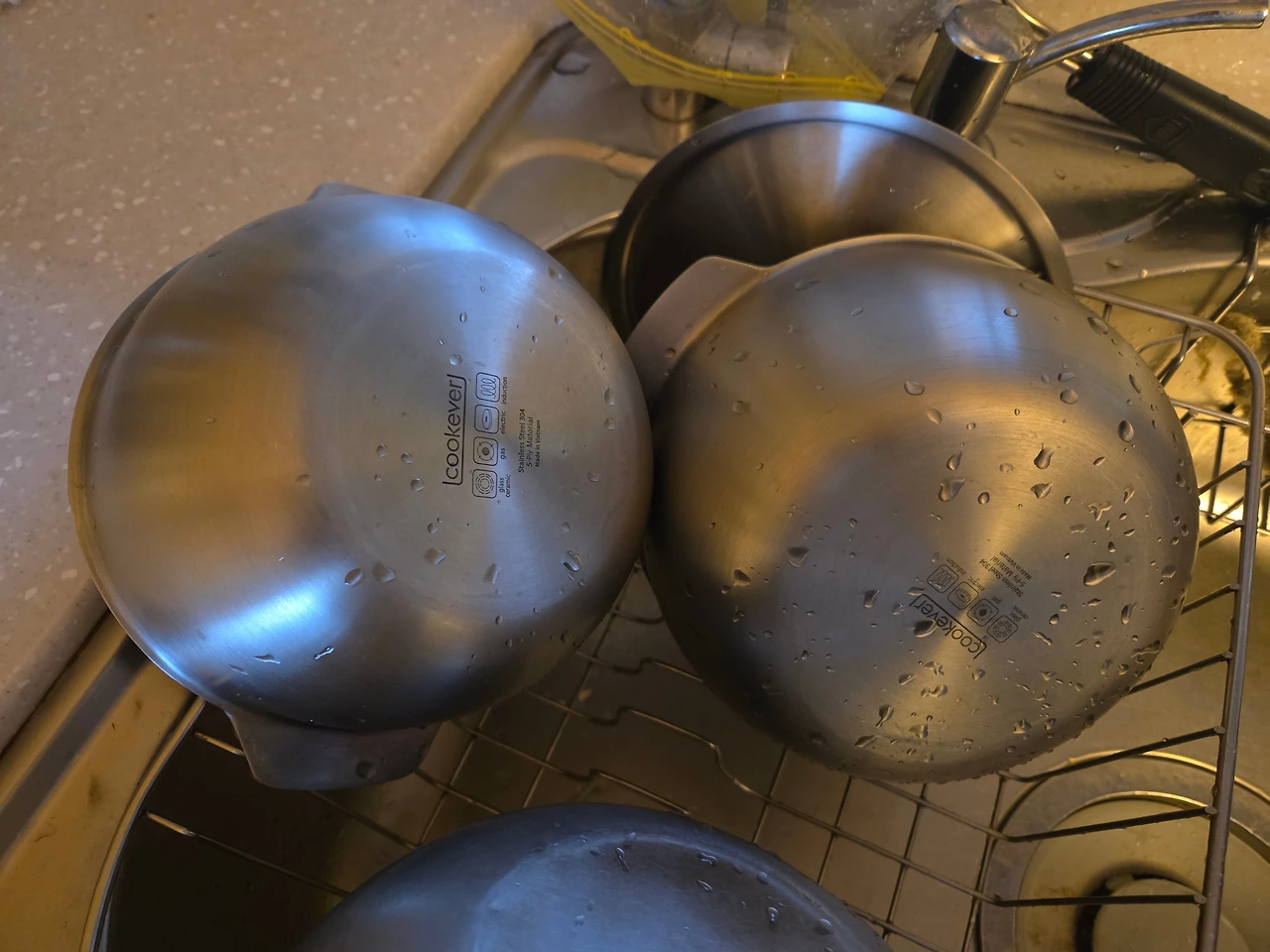 식사 후 설거지. 씻고 뒤집어 놓은 물기 뭍은 냄비들. 시원, 청량하다.