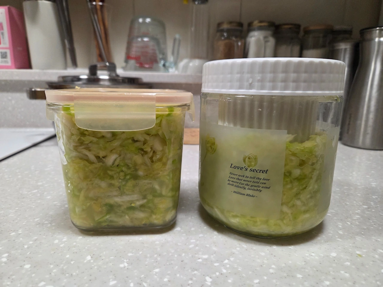 650그람으로 한통을 만들고 집에 있던 자투리들을 모아 한번 더 만들었다. 모은 게 700그람, 처음 만든 거보다 양이 많았다. 양배추절임은 고기 먹을 때 먹기 좋다.