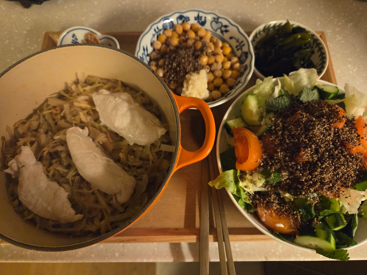 아침식사. 무채 깔고 양배추 소금에 절인 거 올리고 닭인심 올려 저수분으로 익혀다. 샐러드는 양상추, 오이, 토마토, 깻잎에 그릭요거트, 올리브오일, 레몬즙, 들깻가루, 소금을 뿌려 만들었다. 차가워서인지 감기 걸린 것처럼 맛도 향도 잘 느끼지 못했다.