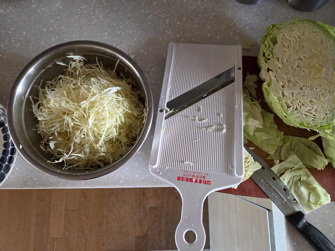 이번 주 장 볼 때 양배추 한 통이 2천 원이었다. 싼 가격에 한통을 집어왔다. 집에 1/4통이 있고 썰어둔 양배추도 있었다. 냉장고에 들어갈 자리가 없어 부엌 바닥에 두었다. 자꾸 보여 써야겠다 싶어 독일식 양배추김치 사우어크라우트를 만들었다. 아주 간단하다. 양배추 양의 2% 소금을 넣고 많이 주물러 주면 된다.