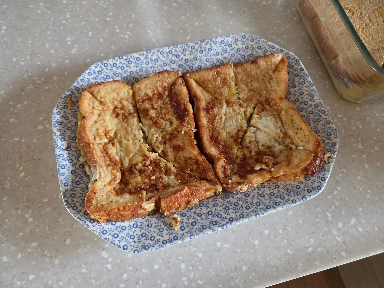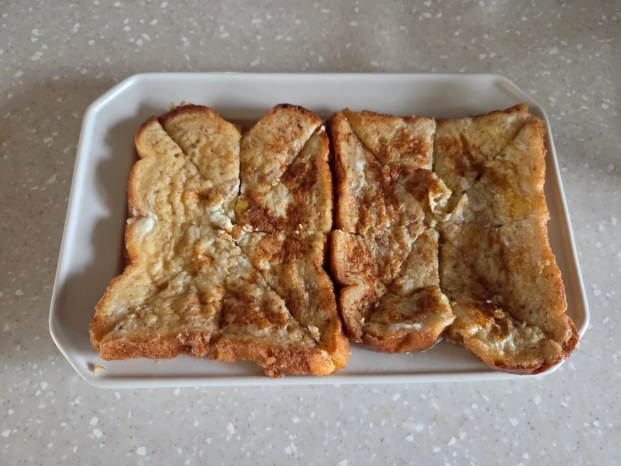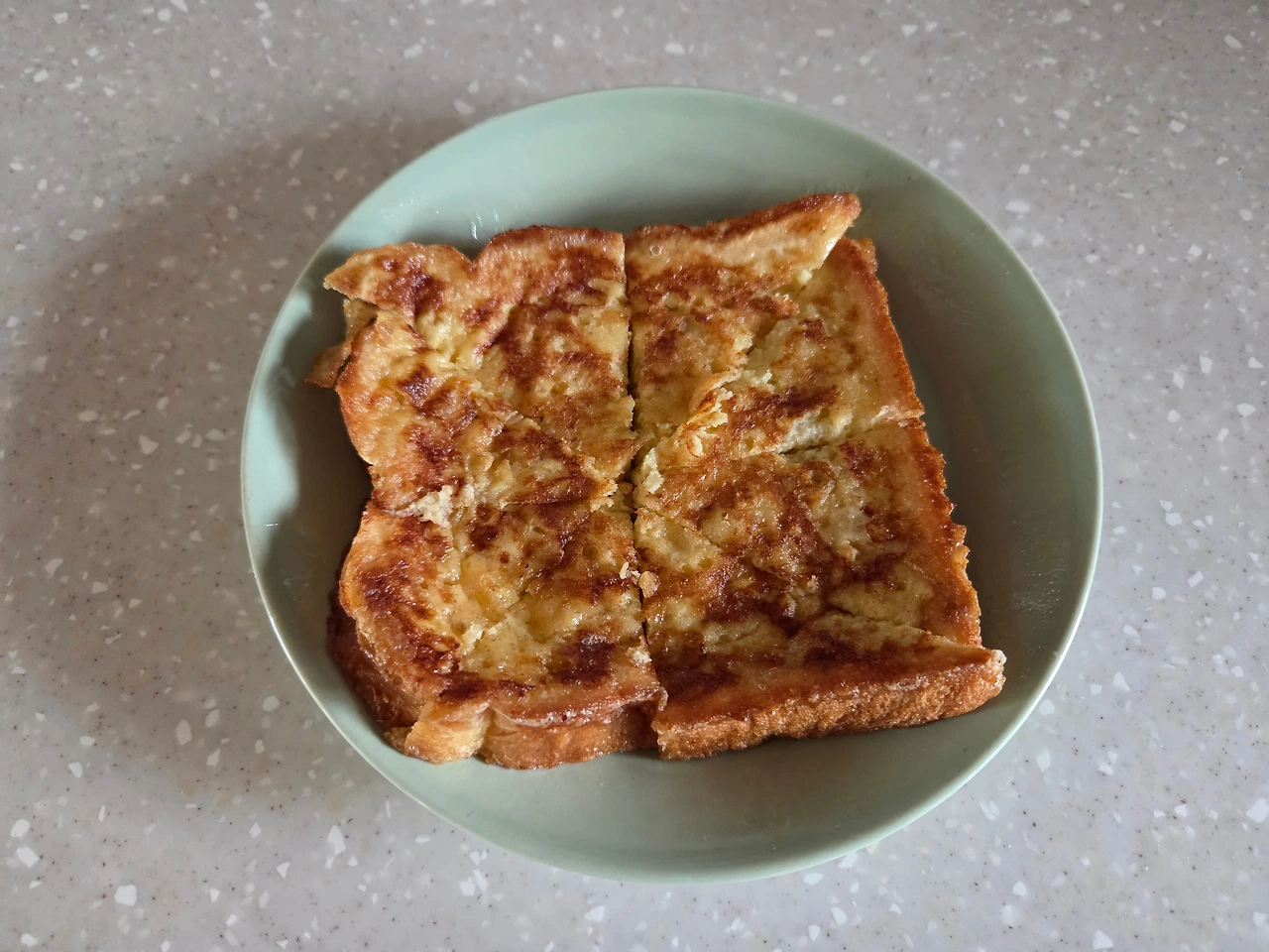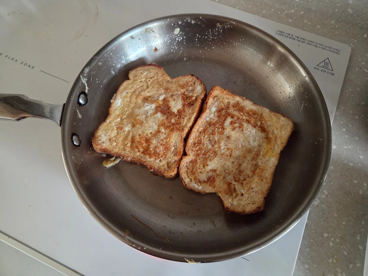 식빵 2장이 들어가는 파이렉스 유리보관통이 프렌치토스트 만들 때 쓰임이 유용하다. 계란 2개를 깨고 우유를 반컵정도 넣고 계피설탕, 소금을 넣고 섞어 식빵 두장을 앞뒤로 재워주면 금세 반죽을 머금었다. 약불에 버터 두른 팬에 천천히 오래 굽는다. 식빵 두장이 포개지 않고 펼쳐 올라가는 직사각 접시에 담아주었다. 어제에 이어 이틀째 먹는 작은아이는 오늘도 맛있다고 했고 안쪽이 푸딩 같다고 했나, 뭐라고 했더라 , 어떤 표현을 했는데 8시간이 지나 생각하려니 떠오르지 않는다. 있는 그대로 말하는 아이의 표현은 틀에 박히지 않은 신선한 표현이라 잊지 않고 기록해두고 싶은 데 그새 잊어버렸다.