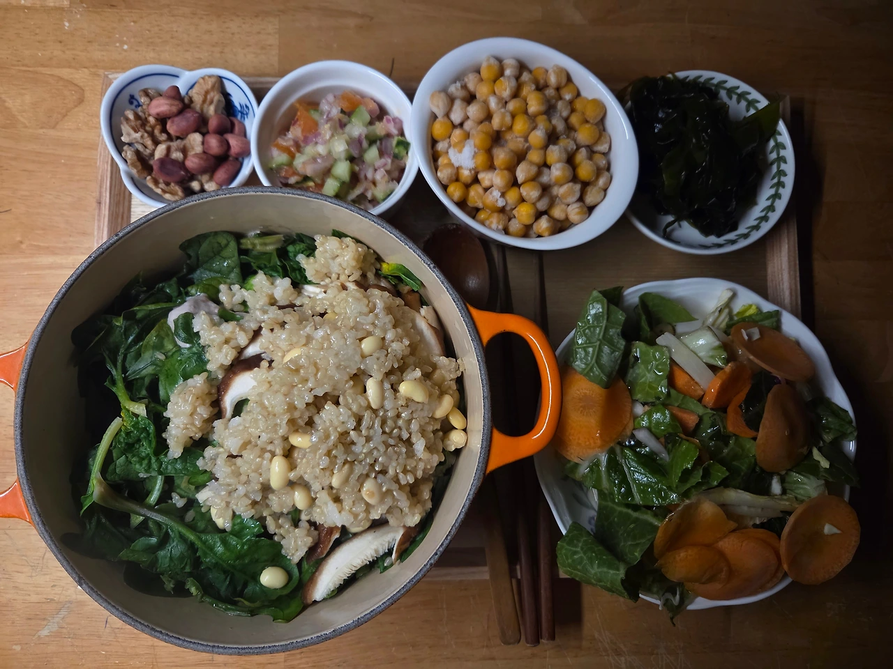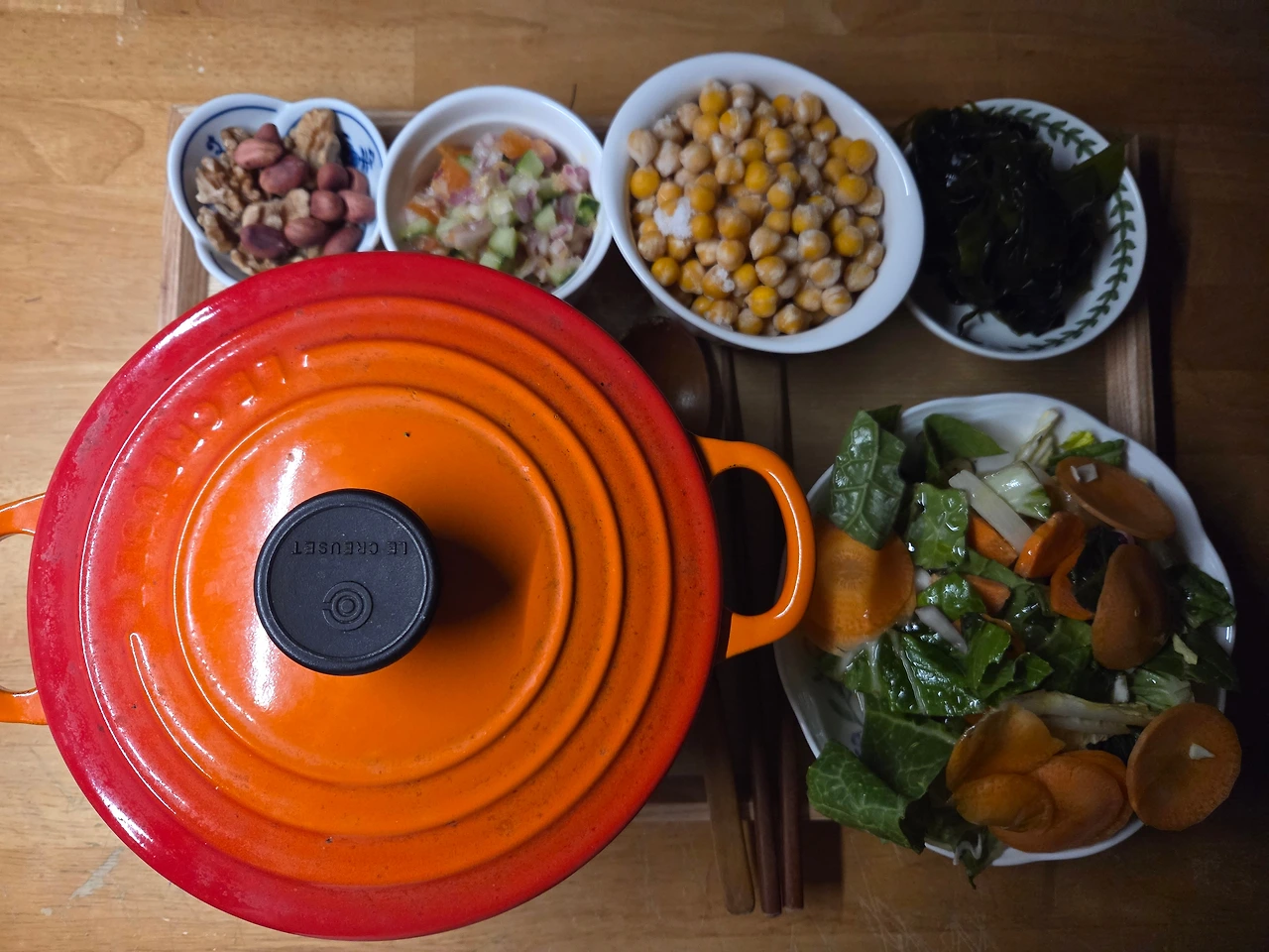가장 먼저 먹고 싶은 생각이 든 무채를 썰었다. 위에 시금치를 씻어 올리고 멸치와 된장, 물 조금을 넣고 중불에 끓였다. 오늘은 추가로 표고버섯도 하나 넣고 청양고추도 하나 썰어서 넣었다. 그 위로 등심 돈가스 고기를 하나 올리고 현미콩밥도 올려 익히고 덥혀 먹었다.