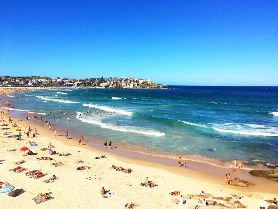 뜨거운 태양의 열기에 목마른 우리는 카페를 찾았고 길게 늘어진 줄을 보다가 맥도널드에 들어갔다. 선글라스를 끼고 해변으로 갈 채비를 한 채 천천히 걸어갔다. 사진으로만 보다 본다이 비치를 눈앞에서 바라보니 말이 안 나왔다. 넓고 긴 해변에 깊은 곳까지 다 비치는 투명한 물색이 아름다웠다. 구름 한 점 없는 파란 하늘과 바다의 파란색을 담아가고 싶을 만큼 아름답다.