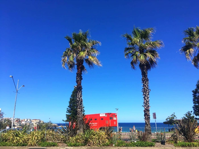 도착할 때가 되자 멀리서도 한눈에 바다가 보였다. 빨간 버스에서 내리고 우린 그대로 멈춰서 주변을 둘러봤다. 야자수가 늘어지고 빼곡히 주차된 차들과 늘어진 기념품 상점과 줄줄이 이어진 카페와 레스토랑 그리고 수영복만 입고 돌아다니는 거리의 사람들을 보니 본다이 비치에 온 게 실감난다.