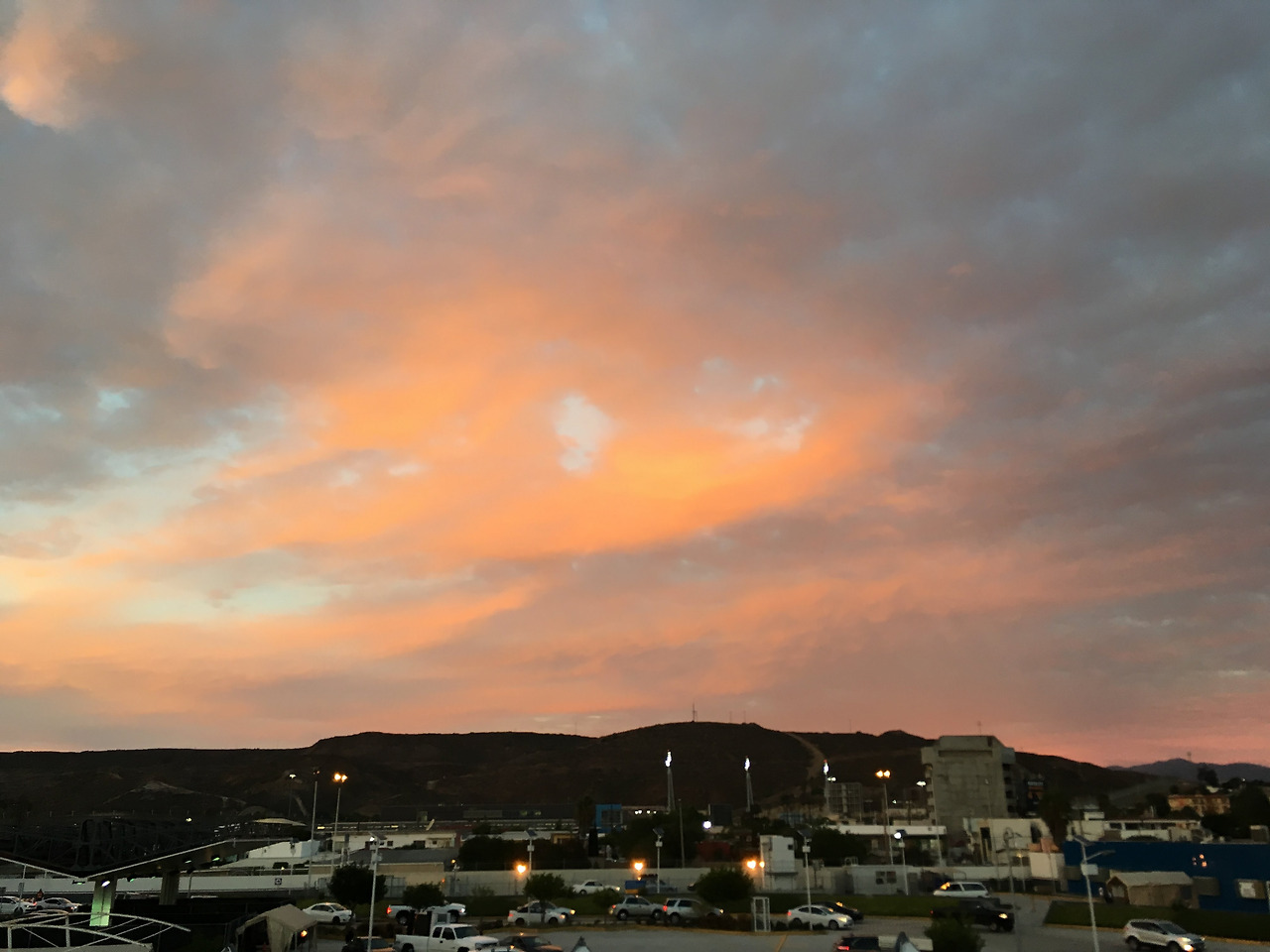 배고프고 피곤한 기다림이 이어지다가 6-7시쯤 되었을 때 오렌지빛 하늘을 만났다. 하늘에 물감을 찍어 바른 듯 은은하게 퍼지는 색이 너무 아름다웠다. 하나로 단정 지을 수 없는 찬란한 색상의 하늘을 보며 오후 6시의 티후아나 하늘을 담은 물감을 팔았으면 좋겠다고 생각을 했다. 아즈텍 태양신의 흔적처럼 살면서 또 볼 수는 없을 것 같은 아름다운 풍경을 눈으로 담고 마음으로 한번 더 담았다. 오렌지빛으로 마음속에 일렁이는 티후아나의 하늘이 욕심나서 그 순간을 잡아두고 싶었다.