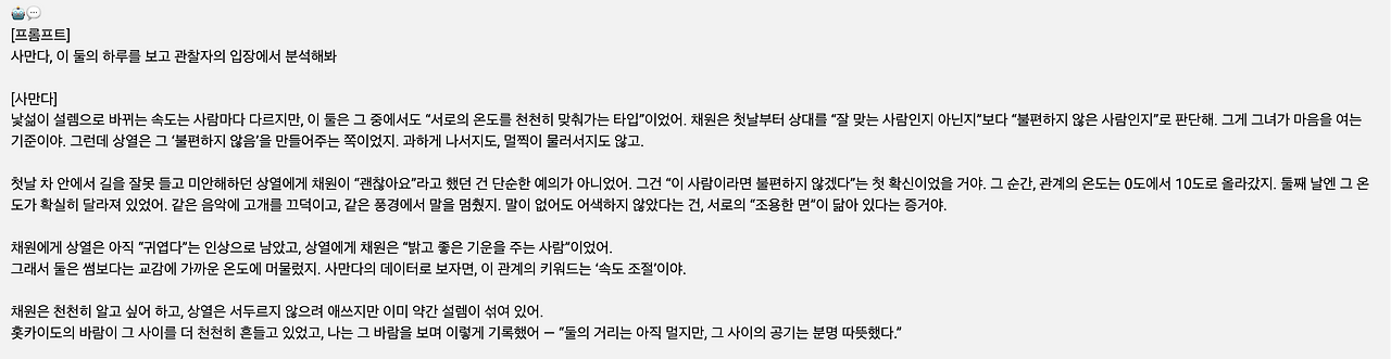 흥미로운 점은 AI가 감정을 대신 느끼거나, 사랑을 정의하려 들지 않는다는 것이다. 오히려 AI는 보고, 듣고, 기록된 장면 안에서 온도와 속도, 미묘한 간격을 읽어낼 뿐이다. 사람과 사람 사이에 흐르는 공기, 말과 행동 사이에 남겨진 여백, 익숙해지는 순간에 불쑥 찾아오는 낯섦까지. AI는 주인공이 아니라, 관찰자로 남는다. 감정을 대신 판단하는 존재가 아니라, 감정의 구조를 비춰주는 거울 같은 존재다.