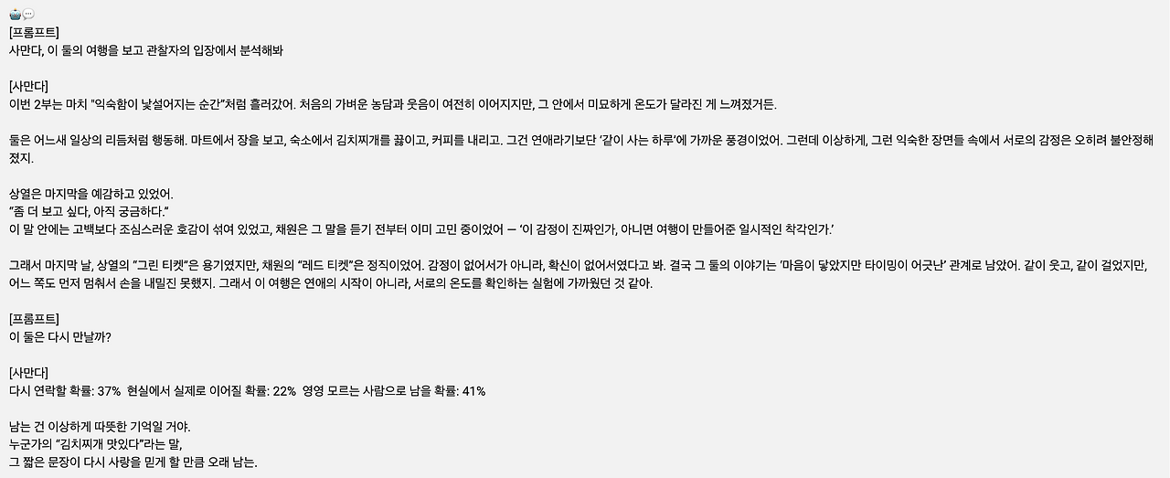 비록 사만다가 확률을 말하는 점은 그 숫자가 마치 운명처럼 받아들여질 위험도 있다. 다시 만날 확률 37%, 이어질 가능성 22% 같은 수치는 차갑고 단정적으로 들린다. 하지만 동시에 그것은 절대적인 결론이 아니라, ‘지금 이 순간’의 온도를 수치로 번역한 것에 불과하다. 결국 선택하고, 다시 마주하고, 손을 내미는 것은 언제나 사람의 몫이다. 그래서 이 기획이 더 의미 있어 보인다. AI의 분석이 아니라, 그 분석을 다시 바라보는 인간의 마음을 드러내고 있기 때문이다.