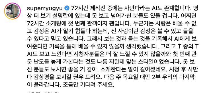 72시간 소개팅이 유튜브에 업로드된 만큼, 영상 소개글이 항상 함께하는데 이 부분까지 읽어줘야 72시간 소개팅을 잘 감상했다고 말할 수 있을 것이다. 최근에 유튜브 채널에서 영상소개글은 대부분 생성형 AI로 작성한다는 것은 현직 모 언론사에 재직하고 있는 입장에서 매우 잘 안다. 그런데, 72시간 소개팅에 쓰인 영상소개글은 프롬포트 형식으로 쓰여있음에도, 인간이 쓴 거 아니야?라는 생각이 들 정도였다.