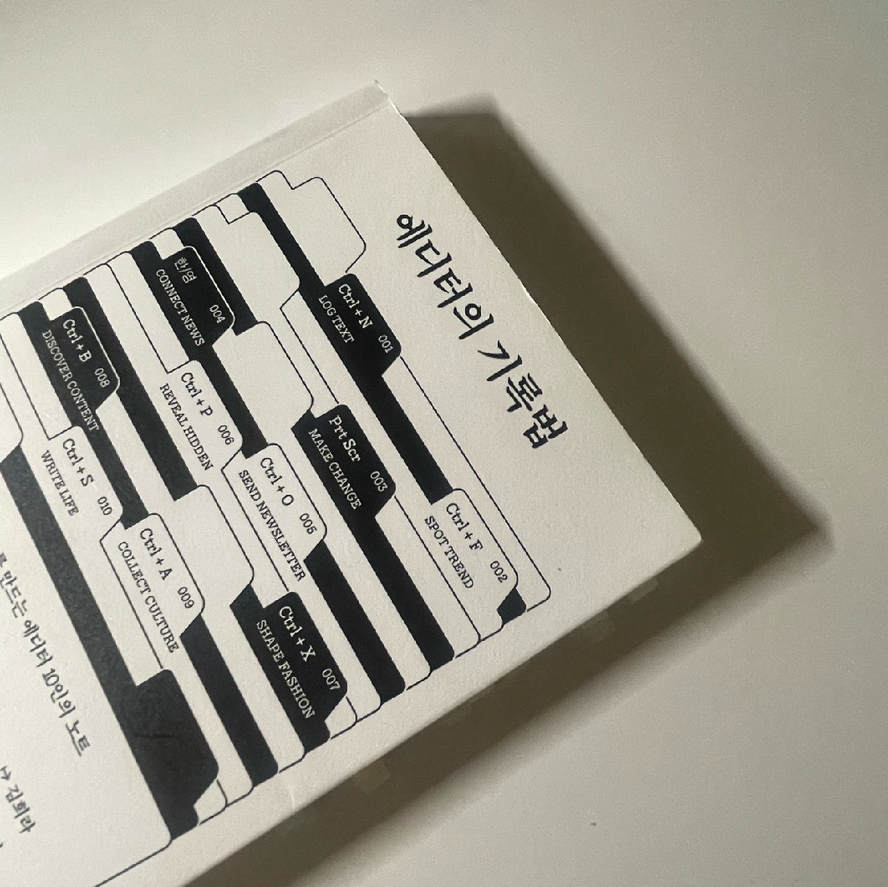 켜켜이 쌓인 폴더 모양의 디자인과 10명의 에디터를 표시한 책갈피는 이 책이 '기록의 아카이브'임을 시각적으로 보여준다. 특히 인상적이었던 건 에디터들만의 특징을 '단축키'로 표현한 방식이었다.