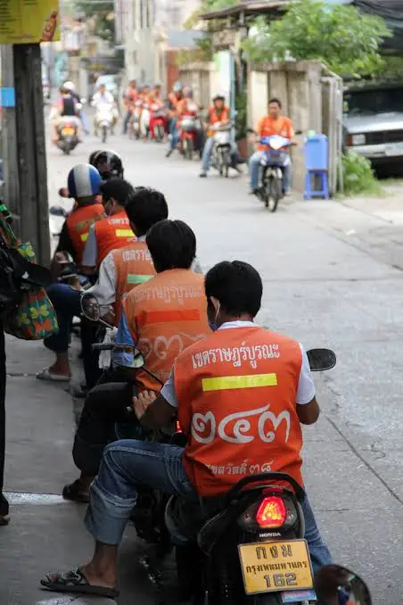 오토바이 택시를 이용하는 방법은 간단하다. 빨간 조끼를 입은 아저씨를 찾으면 된다. 딱히 택시 정류장이 있는 것도 아니다. 그냥 길을 걷다 보면 빨간 조끼를 입은 아저씨들이 2-3명씩 모여 있는데, 그곳에 가서 가려는 목적지를 말하고, (빠이 00카) 가격을 먼저 물어본다. (타올라이카?) 기본요금은 20바트이고 거리가 멀어질수록 가격은 올라가는데 흥정이 필요하다면 흥정에 도전해볼 수도 있다. 그리고 마지막으로 오토바이 아저씨 뒤에 내 몸을 맡기고 신나게 달리면 된다.