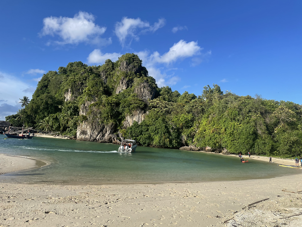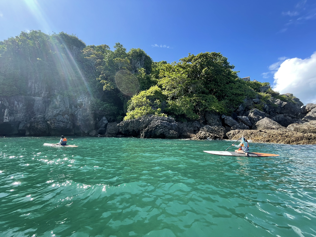 우리는 그곳에서 수영을 하면서 잠깐 휴식을 취했다. 30분 동안 한쪽으로만 노를 저어서 몸이 오른쪽으로 돌아가겠다며 우스갯소리를 하기도 하며 따뜻한 바닷물에 몸을 담그고 있었다. 춤폰 바다가 이렇게 아름다웠다니! 바로 그 그림 같은 풍경 속에 내가 포함되어 있다는 것만으로도 마음 깊숙한 곳에서부터 행복한 감정이 몽글몽글 솟아났다. 사진으로도 모두 담기 힘든 광활한 아름다움.