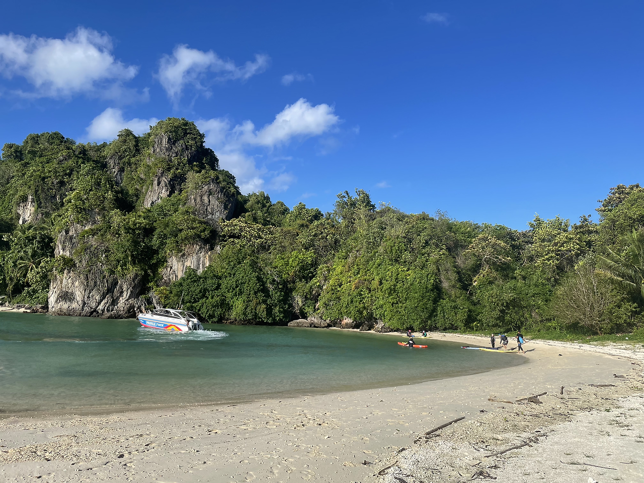 우리의 목표는 사이리 해변에서 출발하여, 바로 앞에 있는 'koh maprao'라는 작은 섬까지 노를 저어 가는 것이었다. '꼬마프라오'라는 이 작고 귀여운 섬은 사이리 해변에서 바로 보일 정도로 아주 가까이에 있었다. 바람은 동쪽에서 강하게 불어오고 있었고, 우리는 그 바람을 뚫고 '꼬마프라오'에 도착하기 위해서 계속 오른쪽으로 노를 저었다. 강한 바람과 흔들리는 바다 위에서 고군분투하는 우리들의 모습에 웃음이 나왔다. 우리는 지금 이 상황이 조금 힘들었지만 웃기고 재미있었다. 바람이 강하게 불어올 때마다 소리를 지르기도 했고, 잠깐씩 평화가 찾아올 때마다 맑고 아름다운 풍경을 감상하기도 했다. 우리는 그렇게 30분 정도 열심히 노를 저어서 겨우 그 섬에 도착할 수 있었다. 꼬마프라오는 정말 아름다웠다.