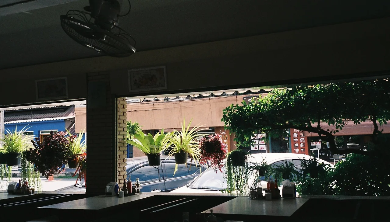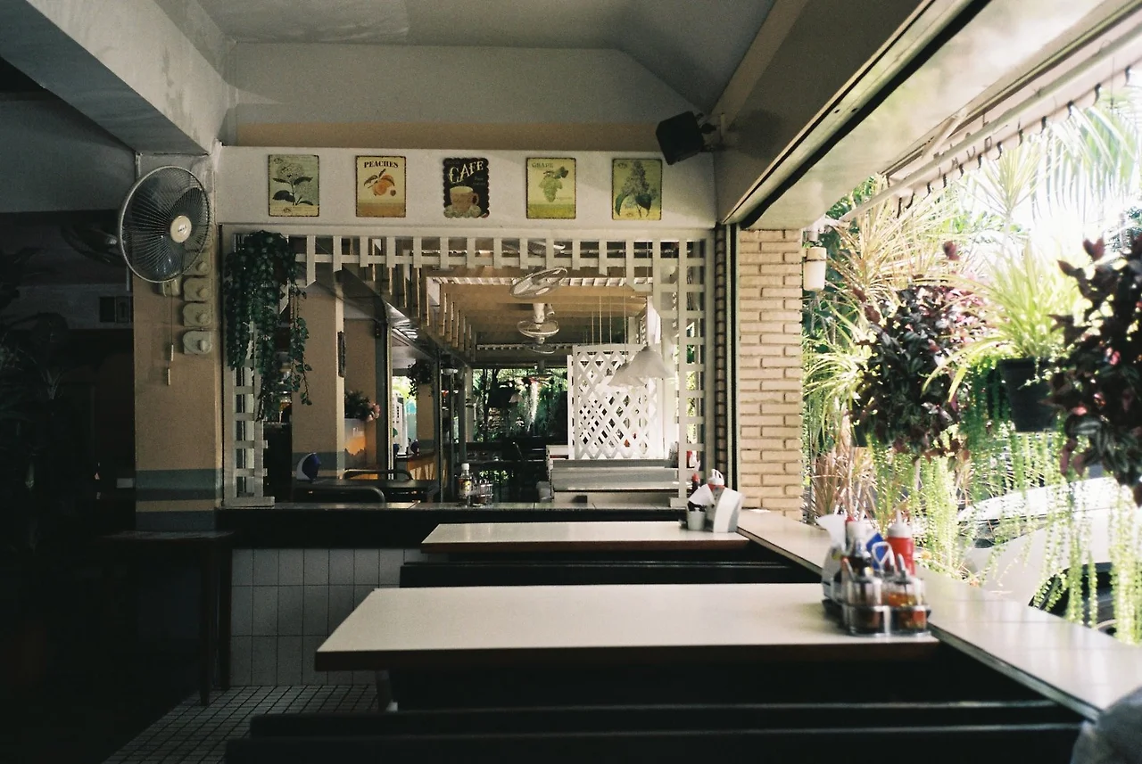 타일로 마감된 바닥과 벽, 벽에 붙어 있는 예쁜 그림들, 창문 없이 뚫려있는 벽 그리고 벽돌 기둥, 그 사이에 걸려있는 아기자기한 초록 화분들.. 한낮의 열기와 돌아가는 선풍기 소리, 오래된 팝 음악.. 그리고 알아들을 수 없는 티브이 소리.