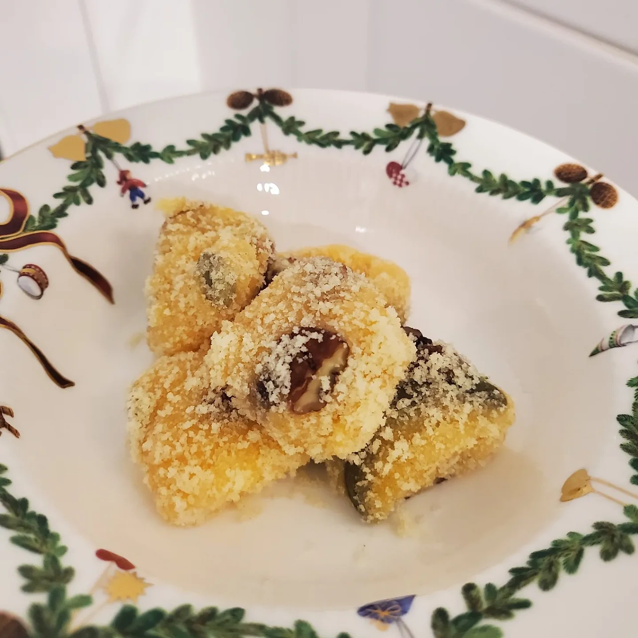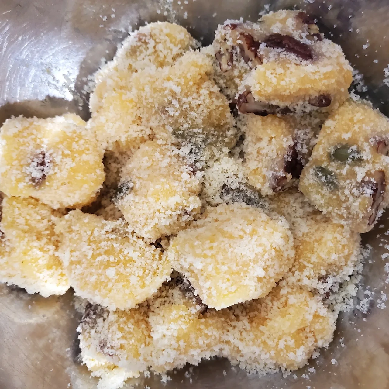 제철을 맞이한 호박은 향이 좋았다. 한국에서 흔히 쓰는 단호박도 늙은 호박도 아닌 버터넛 스쿼시지만 호박 향이 솔솔 나는 것 보니 한국적인 디저트에 딱인 재료랄까. 잘 익혀서 치대는 것 대신 핸드 블랜더로 반죽을 정리해준다. 얼룩덜룩 했던 노란색이 한 톤 비단결 같이 정리되었다. 너무 말랑 거리는 것이 부담이 될까 봐 씹는 맛에 변주를 줄 견과류도 잔뜩 넣어본다. 피칸과 호박씨. 노란색에 갈색과 녹색. 색의 조합이 딱이다. 한입 냠! 이건 제대로 떡이잖아! 나도 1년 넘게 한국에 방문하지 못해 고향의 그리운 맛이 뭔가 가슴에 훅 하고 와닿는 느낌이었다. 한편... 한입씩 먹어보는 행사에서 호박 찰떡 한 덩이는 조금 투박해 보였다. 경단 크기로 자르고 카스텔라에 굴리기로 한다. 그럼 경단이 되는 거지!