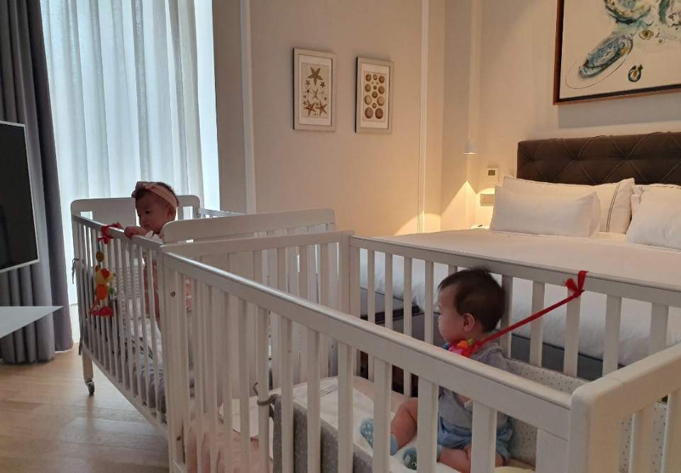 몇 달 전부터 호텔을 찾고 있었다. 한방에 아기 침대 두 개를 놓아주어서 8개월 아기 둘을 같이 재울 수 있으며, 4명이라는 이유로 커넥팅 룸으로 더블룸 두 개를 잡으세요 라고 하지 않을 그런 숙소 말이다. 우리 쌍둥이의 유모차도 지나갈 수 있어야 한다. 그러면 호텔 문턱에 계단이 즐비한 그런 곳은 절대 불가능. 아이들 없이 유모차만 들어도 팔이 빠질 것 같은데. 문이 좁다? 그러면 에러다 그러면 유모차를 접어서 줄여서 지나가고 다시 펴서 아이들은 태운다? 불가능하다. 여러 호텔에 전화를 했다. 한방에 아기 침대를 두 개를 해결할 수 있는 곳과 문턱이 없고 쌍둥이 유모차가 지나갈 수 있고 객실까지 엘리베이터가 운행되는지 등등 결론부터 말하면 잘 찾아서 깨끗하고 세련된 호텔에서 마음 편히 쉬다 올 수 있었다. 아기들도 새로 누워보는 호텔 나무 침대에 귀여운 침구를 너무 좋아했다.