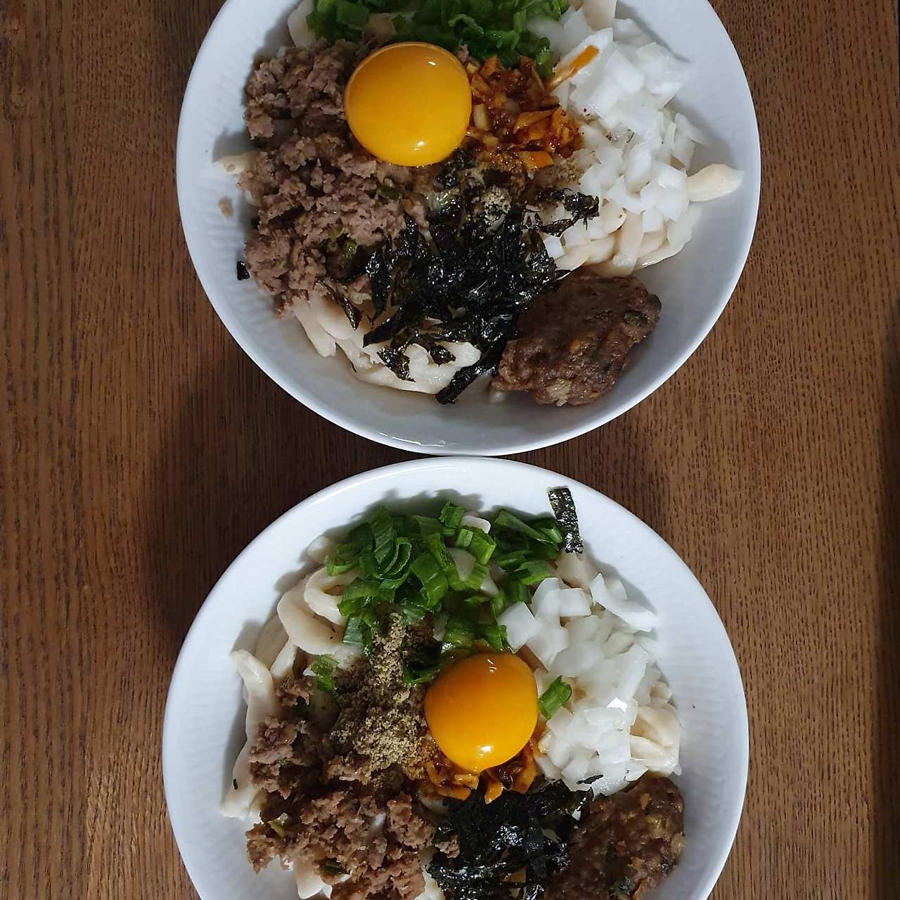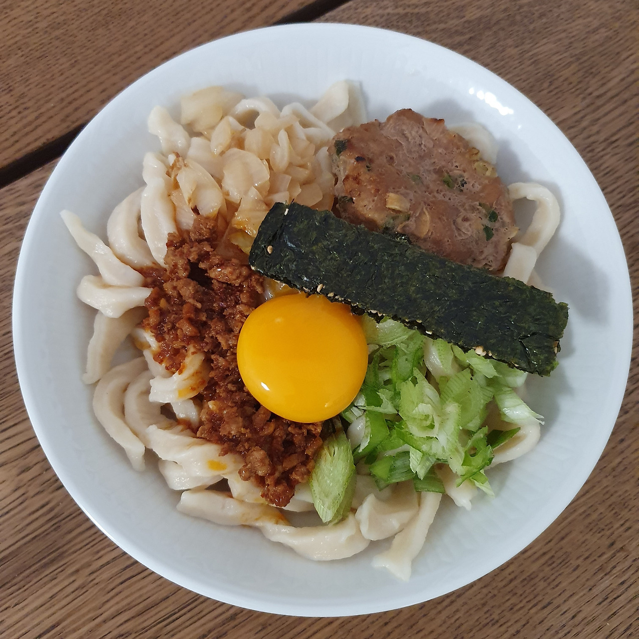 우동 면부터 뽑았다. 반죽이 단단했지만 인터넷의 후기처럼 지퍼백에 넣고 발로 밟아 반죽을 했다. 발 반죽 후 숙성을 시키니 정말 쫀득쫀득한 면이 완성되었다. 탱탱한 우동면을 먹는 게 얼마만인가 그냥 삶아낸 면만 먹어도 너무 맛있다. 역시 이렇게 정성이 들어가면 맛이 없을 수가 없나 보다. 오래전 먹었던 맛을 되살려 소스를 재현해본다. 쯔유와 고추기름, 마늘이 주 재료다. 고명으로 생 마늘 대신 생양파를 올렸는데 이것도한 자칫 텁텁할 수 있는 이 맛에 상큼함을 더해준다. 멘야 하나비에서는 고등어 가루 등을 쓴다고 했었는데 그건 없어서 묵직한 맛은 고기와 들깨 가루 조금으로 냈다.