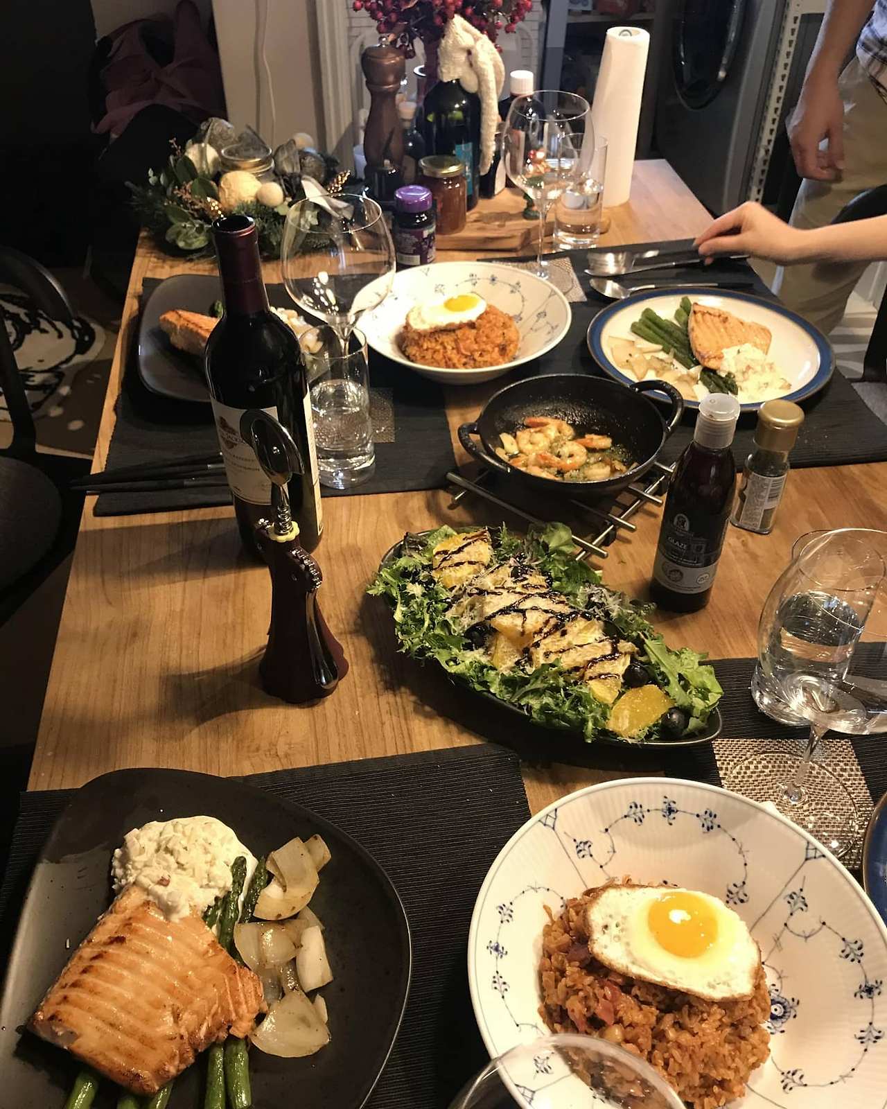 모든 것의 디테일이 훌륭했다. 집밥스러운 푸짐함에 외식스러운 특별함까지 더해져서 말이다. 좋아하는 아스파라거스가 사이드여서 자꾸만 손이 갔고 김치볶음밥 위의 달걀노른자가 찰랑이는 상태여서 고슬고슬함과 촉촉함을 동시에 느낄 수 있는 김치볶음밥이 되었다. 그리고 무엇보다 가장 아낀다는 접시를 내어준 것에 뭔가 고마움이 가득해졌다. 장인이 파란 물감으로 그림을 그렸고, 덴마크에서는 왕실에서도 사랑받는다는 바로 그 접시 위에 놓아주었다. 특별할 것 없이 자주 보는 보통의 친구인데 이런 정성스러운 식탁 차림이라니. 짙은 색 위주의 그릇과 함께 두어 더 돋보였던 포인트 접시. 사진에서만 봤지 실제로 보니 더 예뻐 스페인에 오자 나도 한번 따라 사본건 비밀 아닌 비밀이다.