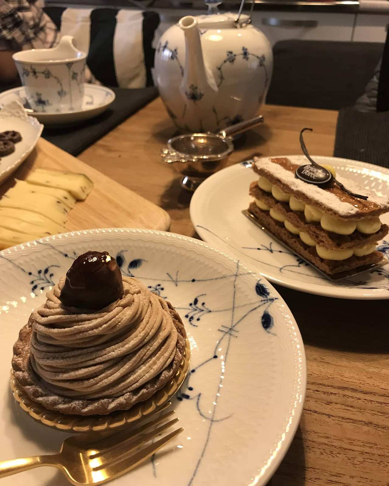 바쁜 직장인 부부가 식사 초대를 해준다는 고마움에 우리도 와인과 디저트를 준비했다. 직접 만들진 못했지만 색색깔의 정교한 조각 케이크를 친구도 마음에 들어하는 듯했다. 지나가는 늦가을이 아쉬워 준비한 밤 베이스의 몽블랑과 생과일을 좋아하신 다는 친구 남편 분을 고려해서 딸기가 잔뜩 올라간 타르트, 그리고 언제나 실패가 없는 밀풰유 까지. 달콤한 디저트와 짭짤한 치즈까지 함께 하며 루비 빛이 넘실대는 와인잔을 함께 드니 뭔가 축하할 일이 많이 생길 것 같은 기분이 들었다. 와인 잔이 부딪히는 소리도 참 좋다. 그렇게 그날은 주말의 여유를 즐기며 웃었다. 날씨가 춥다며 티팟에 차까지 우려 주는 친구. 그녀는 지금 따뜻한 연말을 보내고 있을까.