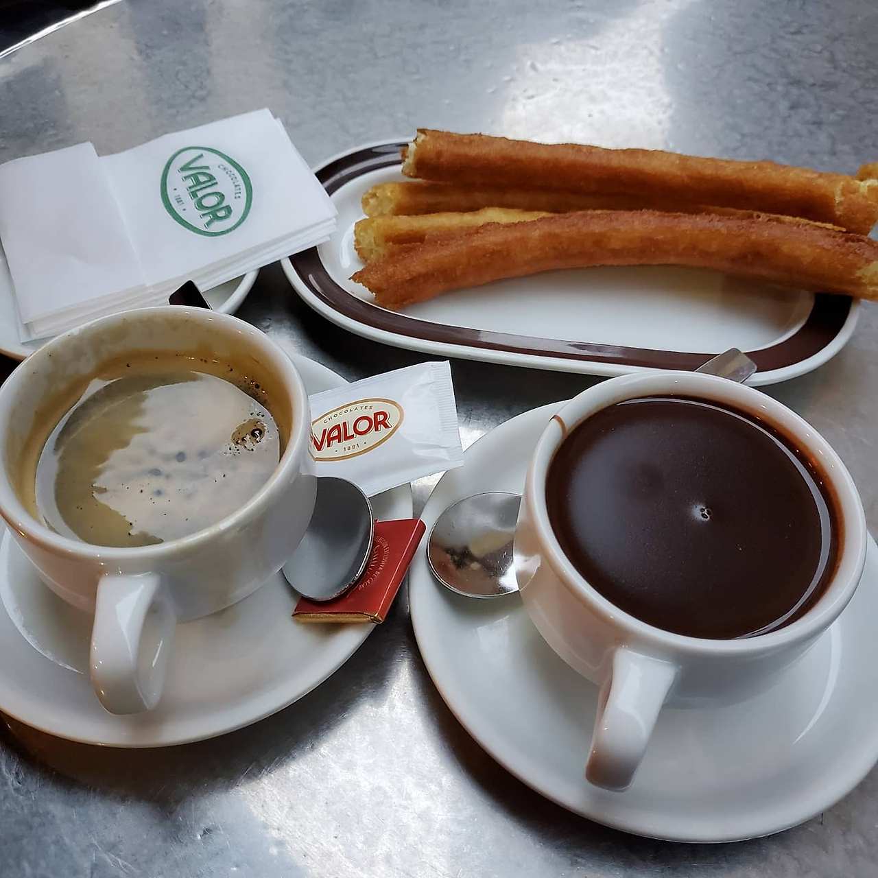 날씨가 좋아서 바깥에 좀 더 있을만하면 조금 더 걸어가서 Valor이라는 츄레리아에 들른다. (츄레리아Churreria는 추로스를 파는 가게라는 뜻의 스페인어) 놀이동산에서 먹던 계피 설탕 가득한 추로스는 잠시 잊어도 된다. 스페인의 추로스는 달지 않고 훨씬 작게 여러 조각으로 나온다. 츄레리아에서는 쉴틈 없이 추로스를 커다란 기름통에 튀겨낸다. 다 튀겨서 동동 떠있는 추로스를 쇠꼬챙이로 하나 둘 셋 넷 얼른 건져 접시에 올려 가져다주는데, 우리 집 아기들은 여기서 신세계를 맛보았다. 세상에 이렇게 맛있는 게 다 있나 하는 표정으로 호호 불어가며 먹는다. 크리미 한 핫초코와 함께 먹어야 제맛이지만 아직은 초코를 먹기에 어린 나이. 조금 더 자라서 핫 초코에 찍어먹으면 얼마나 좋아할까 상상만 해도 흐뭇하다. 가족들과의 이런 나들이가 얼마나 소중한지 이전엔 미쳐 알지 못했다.