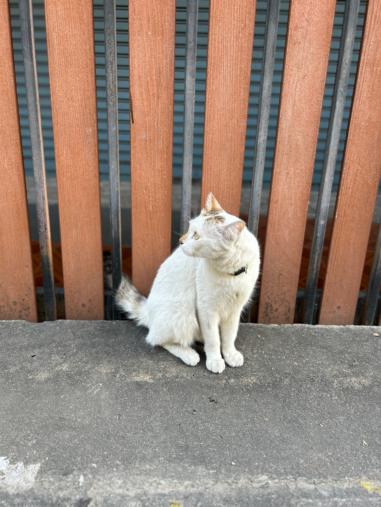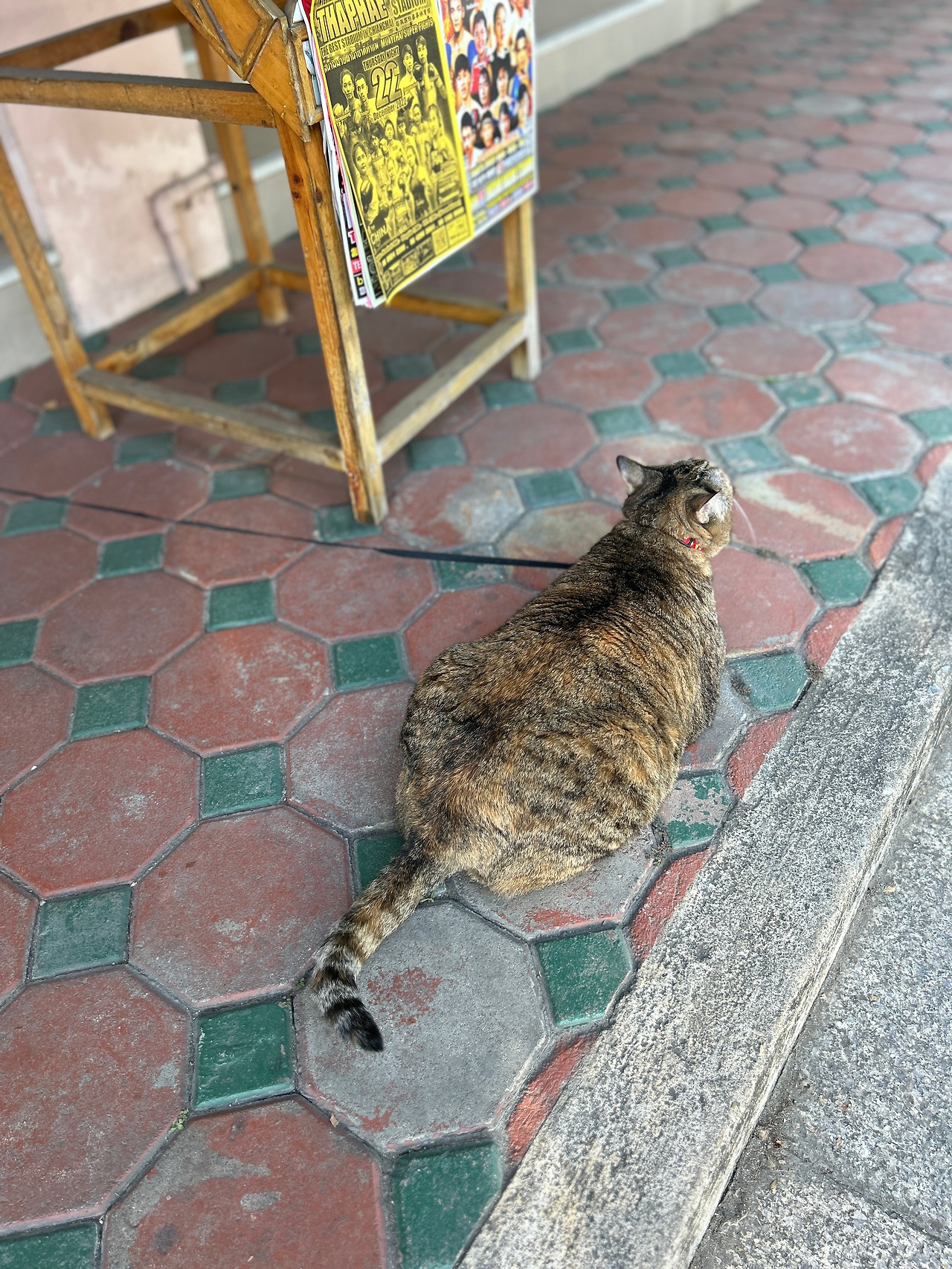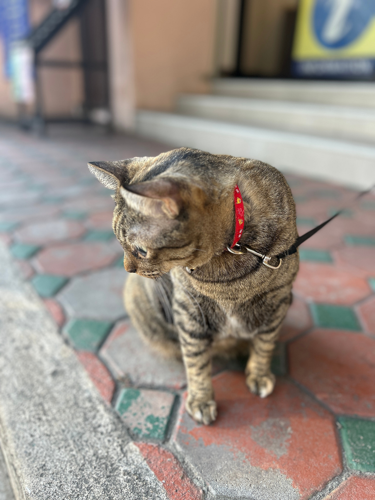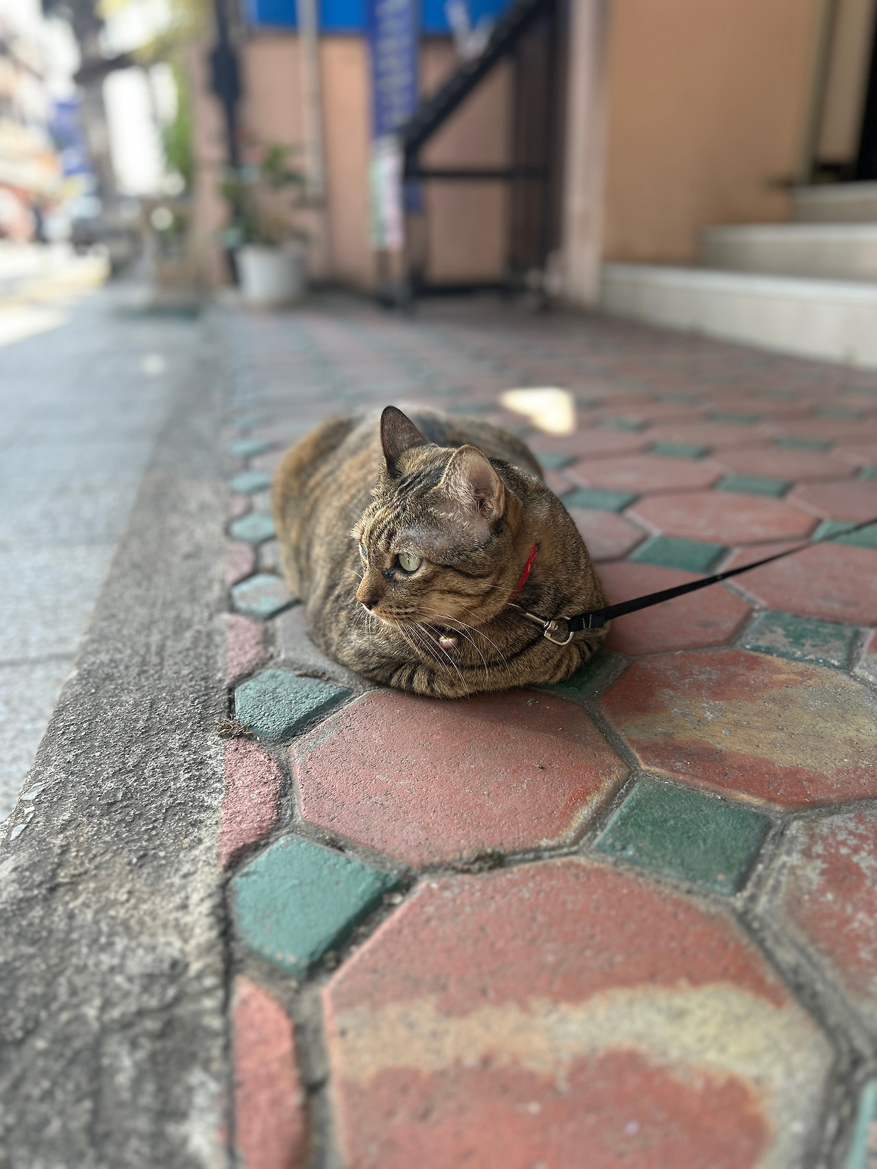 그런데, 인도 한복판을 한량처럼 서성이는 고등어고양이에게 긴 목줄이 달려있다. 고양이를 설마 묶어두고 키우는 건가 싶어 긴장했는데, 가까이 다가가보니 까만 줄의 한쪽 끝은 가게 문 옆 기둥에 단단히 묶여있고, 나머지 한쪽엔 고리가 달려있어 고양이 목에 달린 목걸이에 수시로 걸었다가 떼었다가 하는 모양이다. 집사는 문 안에서 고객을 응대하느라 바쁘고, 고양이는 볕 따스한 한낮을 맞아 목줄을 걸고 집사 없이 혼자 ‘셀프산책’을 하는 중. 줄 길이가 딱 상점 안에 있는 집사의 시야를 벗어나지 않고 고양이가 가게 앞을 왔다 갔다 할 수 있는 정도다. 가게 앞 도로에 큰 차들이 연신 지나다니는 것을 보니, 집사는 혹 사랑하는 고양이가 위험한 도로로 튀어나가 사고라도 당할까봐 걱정이 되어 목줄을 거나 보다.