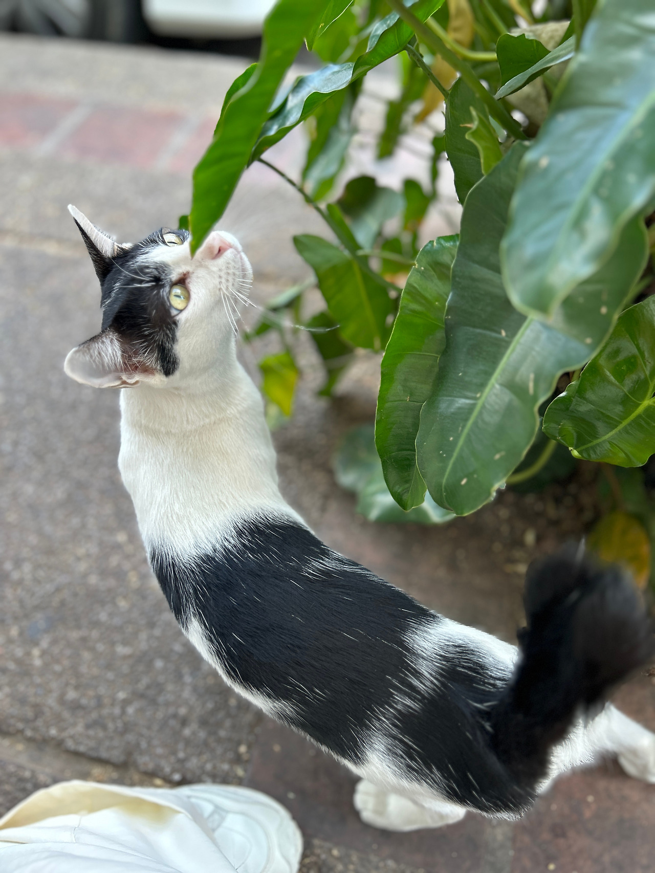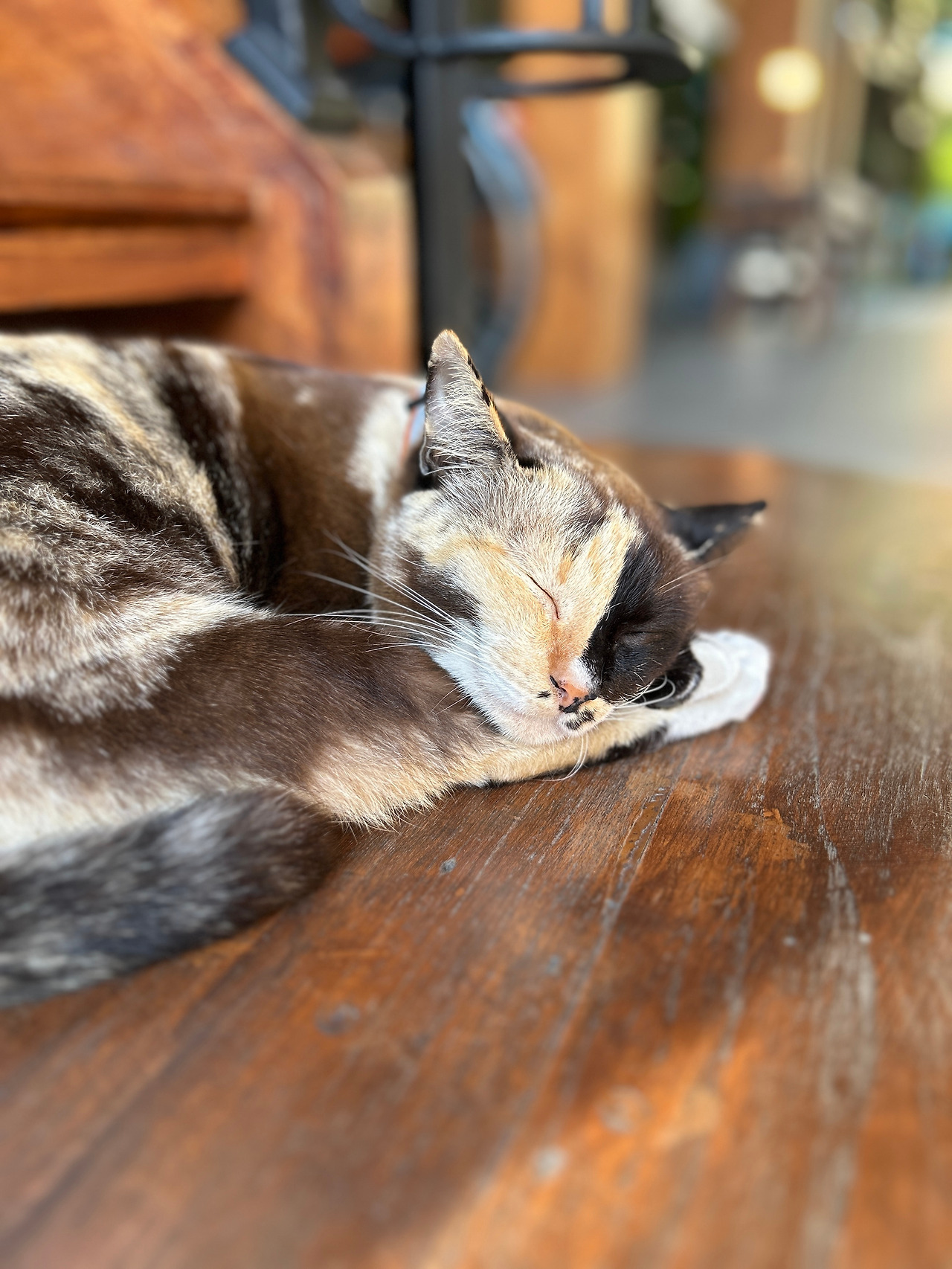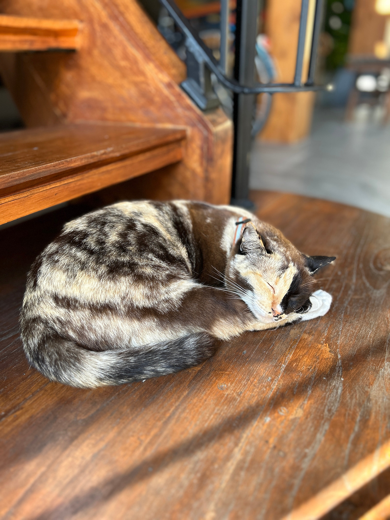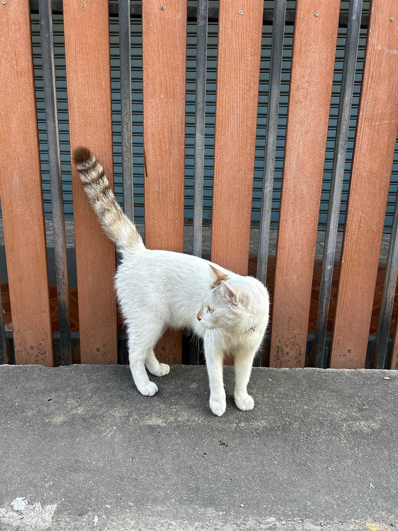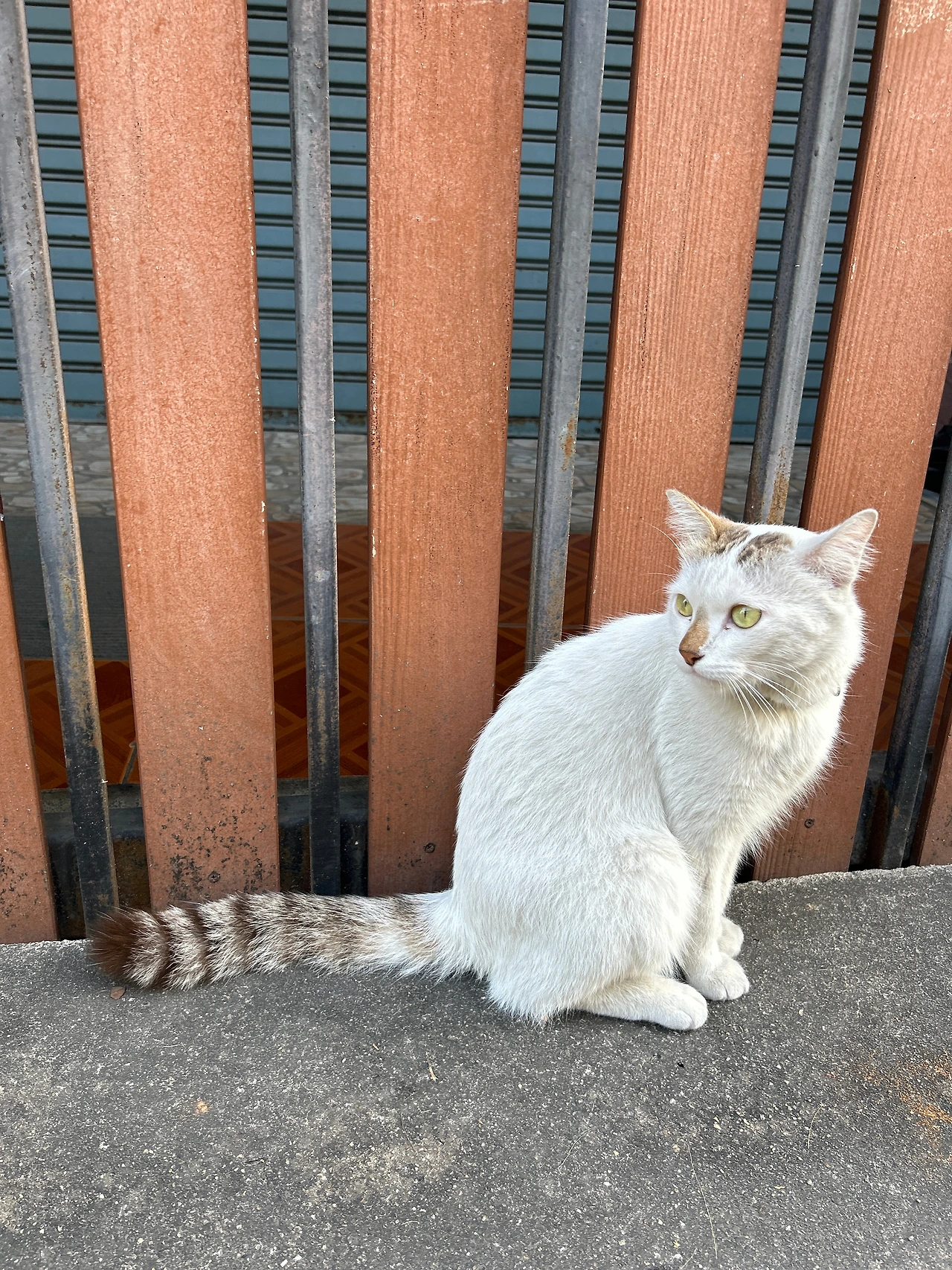 그런데, 인도 한복판을 한량처럼 서성이는 고등어고양이에게 긴 목줄이 달려있다. 고양이를 설마 묶어두고 키우는 건가 싶어 긴장했는데, 가까이 다가가보니 까만 줄의 한쪽 끝은 가게 문 옆 기둥에 단단히 묶여있고, 나머지 한쪽엔 고리가 달려있어 고양이 목에 달린 목걸이에 수시로 걸었다가 떼었다가 하는 모양이다. 집사는 문 안에서 고객을 응대하느라 바쁘고, 고양이는 볕 따스한 한낮을 맞아 목줄을 걸고 집사 없이 혼자 ‘셀프산책’을 하는 중. 줄 길이가 딱 상점 안에 있는 집사의 시야를 벗어나지 않고 고양이가 가게 앞을 왔다 갔다 할 수 있는 정도다. 가게 앞 도로에 큰 차들이 연신 지나다니는 것을 보니, 집사는 혹 사랑하는 고양이가 위험한 도로로 튀어나가 사고라도 당할까봐 걱정이 되어 목줄을 거나 보다.
