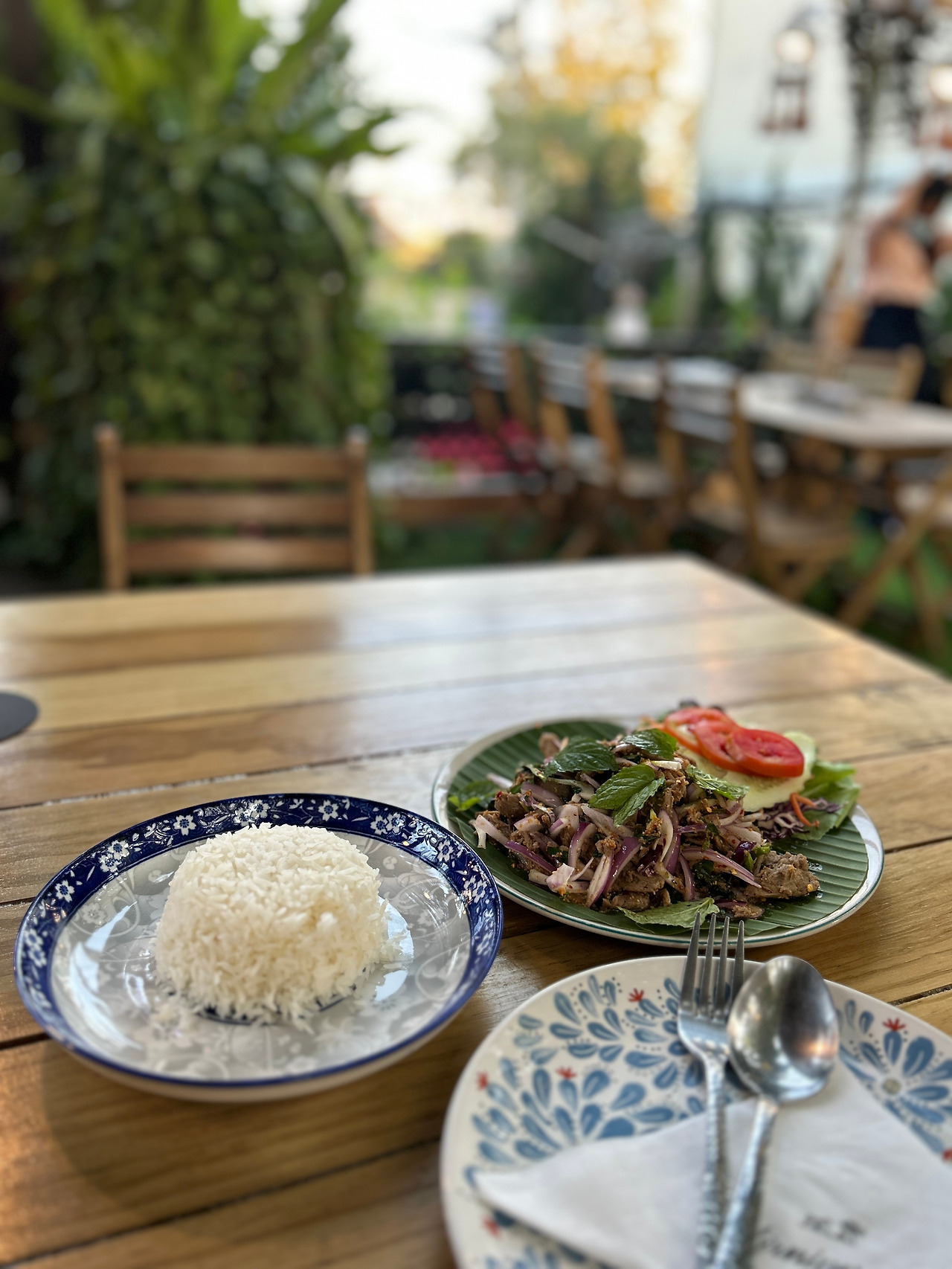 목적지인 식당에 도착했더니, 테라스엔 벌써 발 디딜 틈이 없다. 12월의 치앙마이는 야외에서 식사를 즐기기에 딱 좋은 정도로 뜨겁지만, 내내 걸어 다니고 있는 나는 굳이 야외좌석을 고집할 이유가 없어, 만석에 대한 아무런 미련 없이 문 안으로 들어선다. 실내도 이미 만석이지만, 다행히 홀 한 가운데 제일 작은 탁자 하나가 비어있다. 어젯밤에 이어 얻은 ‘나 홀로 여행’의 작은 행운. 자리에 앉자마자 매일의 루틴대로 오늘의 아침식사를 주문했다.