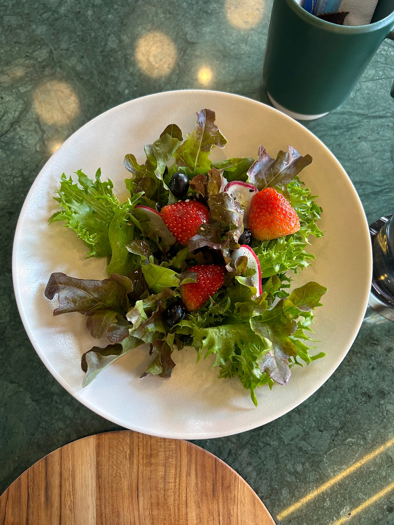 정성들여 깎은 알록달록한 과일조각들과 바삭바삭하게 구운 그래놀라, 허브 한 줄기를 곁들인 벌집꿀까지, 캔버스에 그려진 그림을 들여다보듯, 그릇 속에 정갈히 놓인 것들을 하나하나 천천히 음미했다. 브런치메뉴를 주문하면 저렴한 가격에 추가할 수 있는 가든샐러드는 쌉쌀하고 달큰한 잎사귀들이 섞인 푸른 야채에 블랙올리브와 얇게 썬 적환무를 간단히 얹어서 통후추와 올리브오일, 발사믹으로 딱 필요최소한의 간만 했는데, 자연스러운 슴슴함에 빨간 딸기가 딱 적절하게 달콤한 맛을 얹어주어 좋았다.