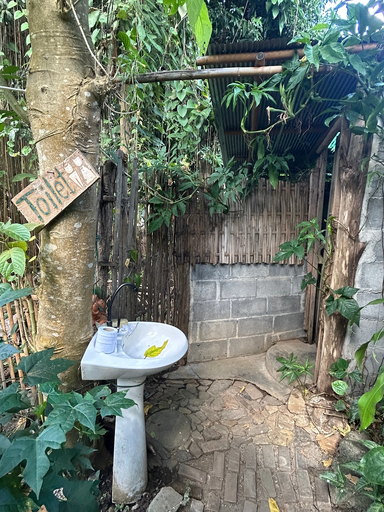 오두막을 내려와 보니 뒤편에 작은 숲이 펼쳐져있다. 거인 같은 나무가 마법으로 하나하나 짜내어 인간세상까지 주렁주렁 늘어뜨려 준 것만 같은 줄기들 사이를 걷고 있으니, 곧 다른 세계에 닿을 것만 같은 기분. 이윽고 닿은 곳은 화장실이지만, 야외세면대에서 커다란 나무들에 둘러싸여 손을 씻고 있으니 새벽마다 토끼가 와서 세수하는 깊은 산속 옹달샘에 온 것 같다.