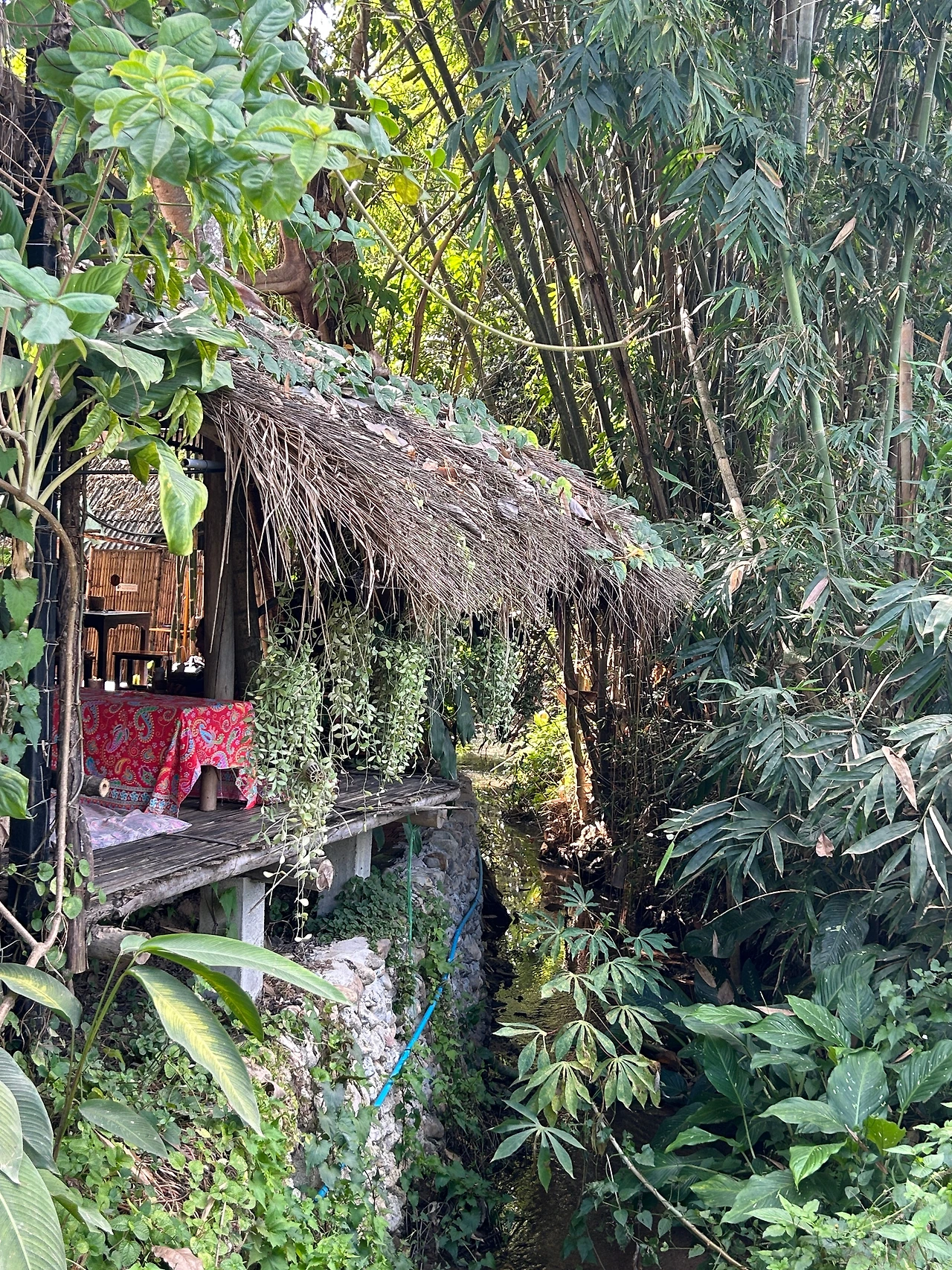 더운 나라에 오면 좋은 건, 안과 밖의 경계가 희미한 것. 사방이 훤히 뚫린 오두막에 앉아 여름의 햇살과 바람 속에 정성들여 담은 텃밭 한 접시를 시간을 들여 천천히 먹었다. 산간지역이어서인지, 빠이는 뜨거운 낮에도 스치는 바람이 참 좋다. 빨간 용과스무디 한 잔까지 남김없이 비운 뒤, 뙤약볕이 내리쬐는 차양 밑으로 자리를 옮겼다.