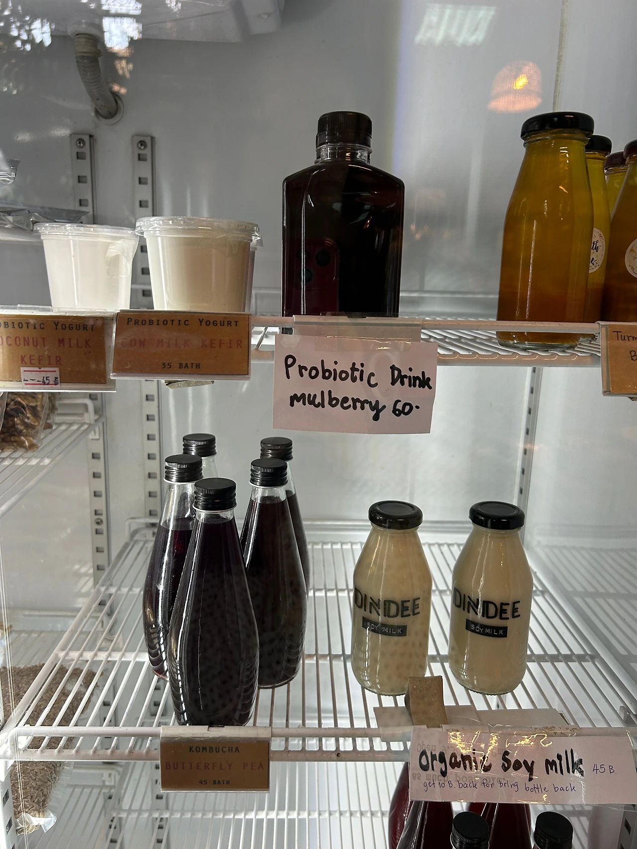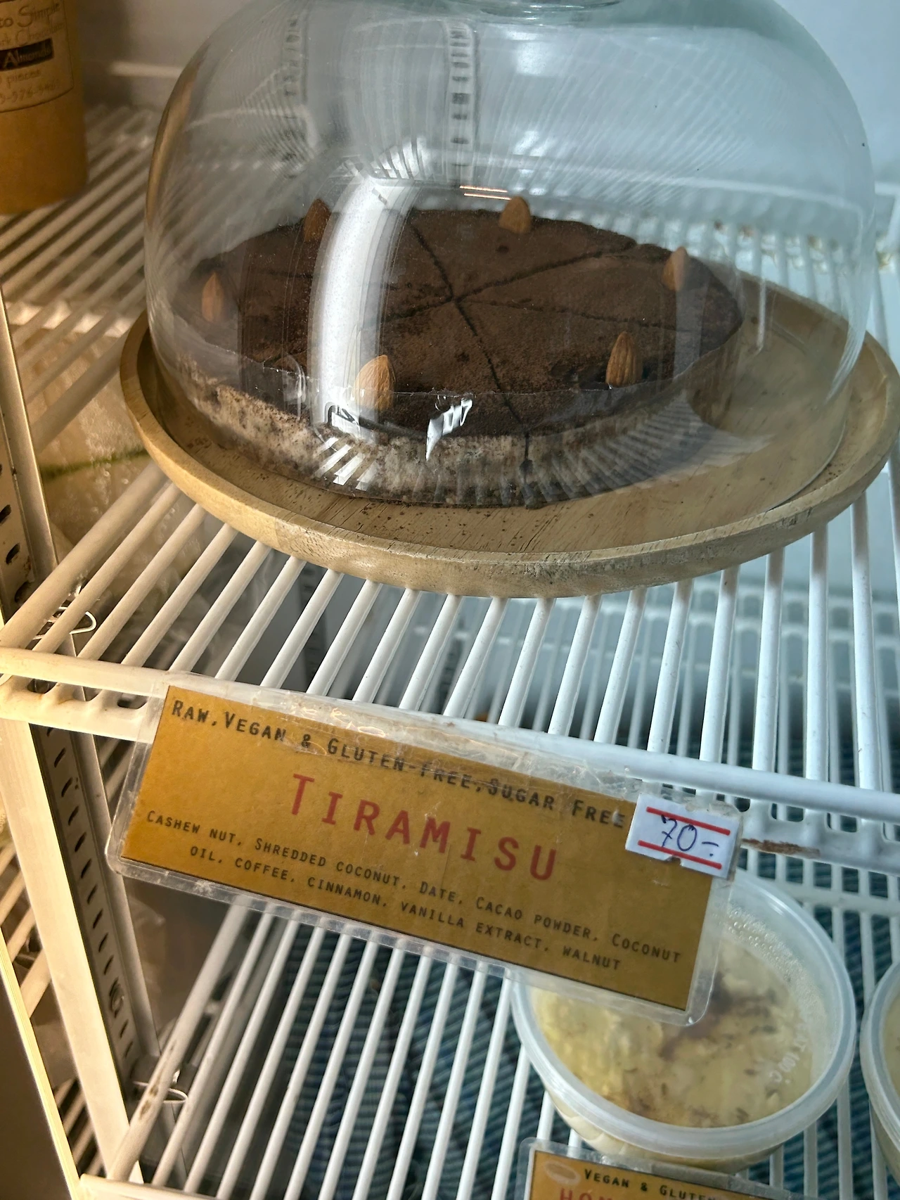 이 식당은 크게 식사하는 공간과 식품, 화장품, 의류, 위생, 생활용품 등 다양한 비건제품들을 소개하고 판매하는 공간으로 나뉘어있는데, 지난번에 식사를 마치고 판매공간을 둘러보니 글쎄 식당메뉴엔 적혀있지 않았던 비건쿠키와 케이크, 발효유 따위가 냉장고에 그득그득하지 않던가! 판매공간의 제품들도 식당에서 먹는 것이 가능하다고 해서 캐슈넛으로 만든 비건 티라미수케이크를 한 조각 주문했다.