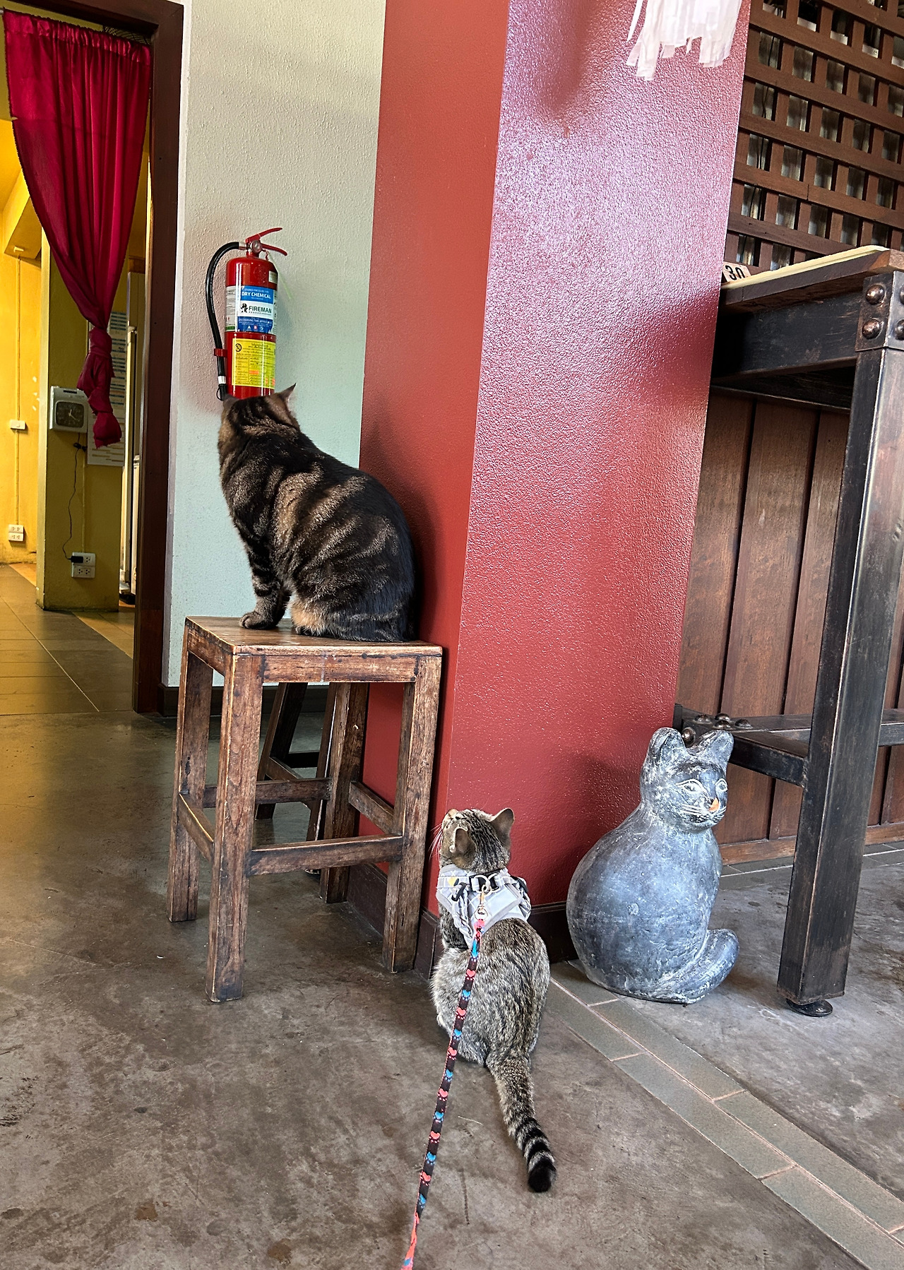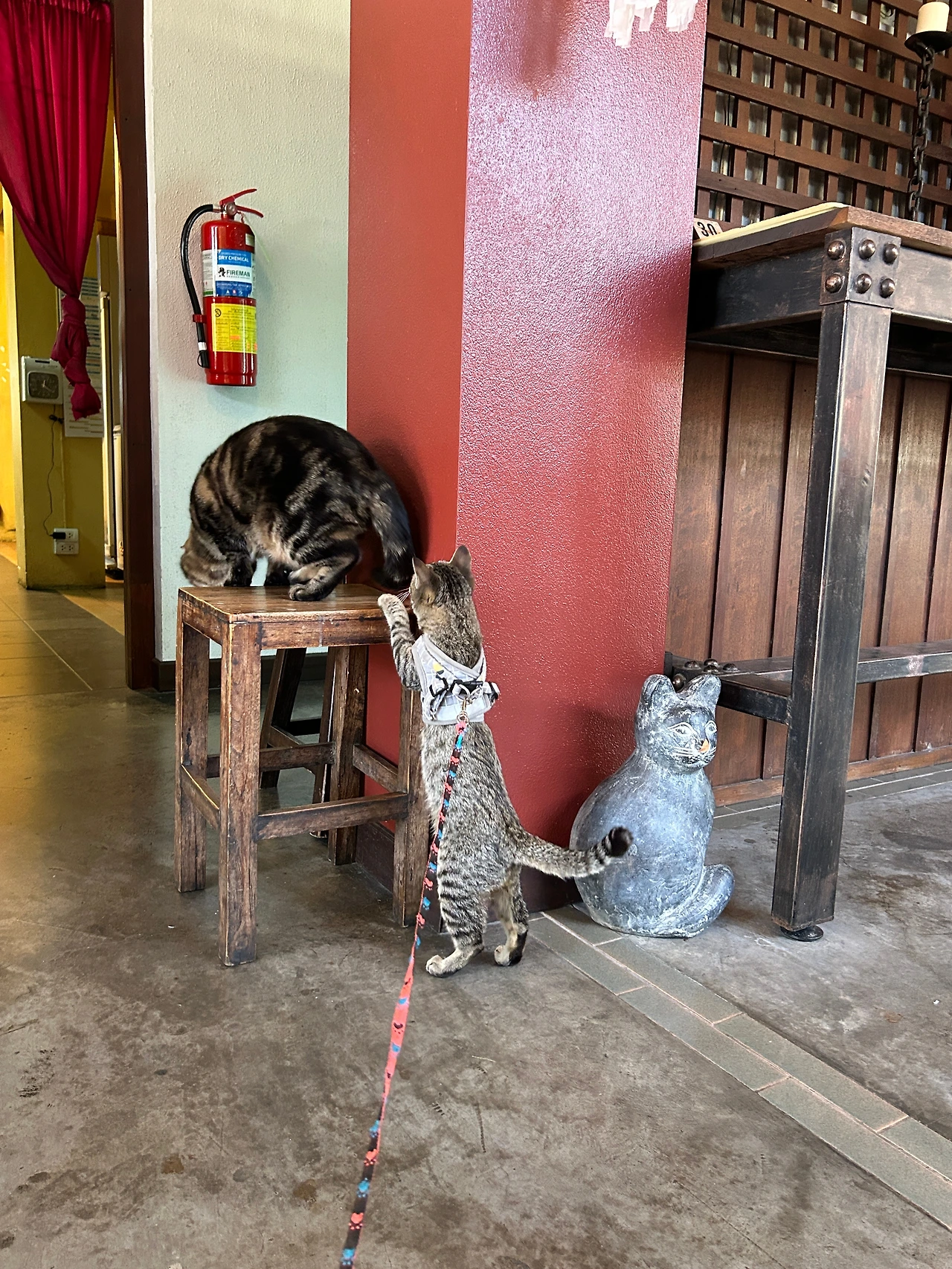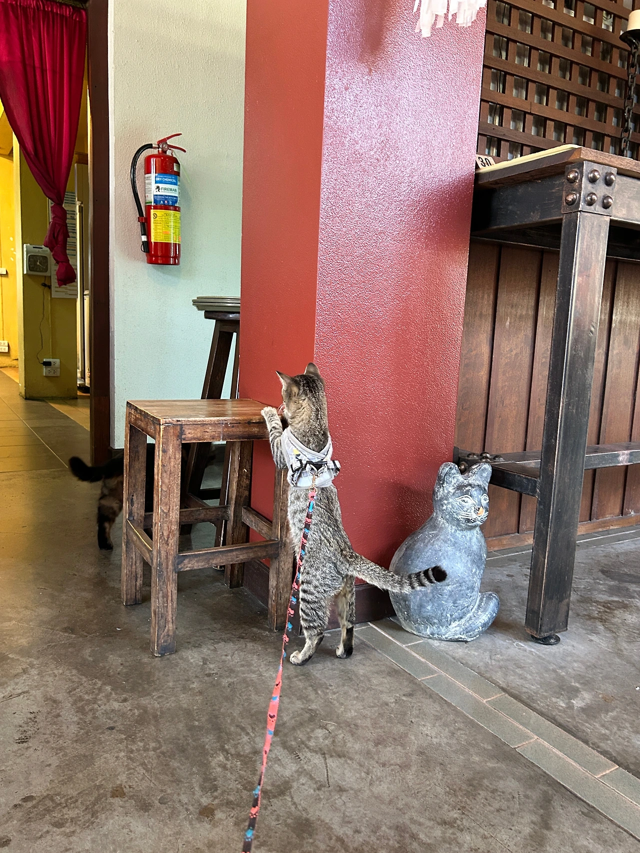 한 살이 채 되지 않아 보이는 어린 고양이는 혹시 사고라도 날까봐 걱정되었는지 하네스를 채워두었고, 어른냥이는 제 맘대로 식당 안을 여기저기 자유롭게 돌아다니는 모양이다.