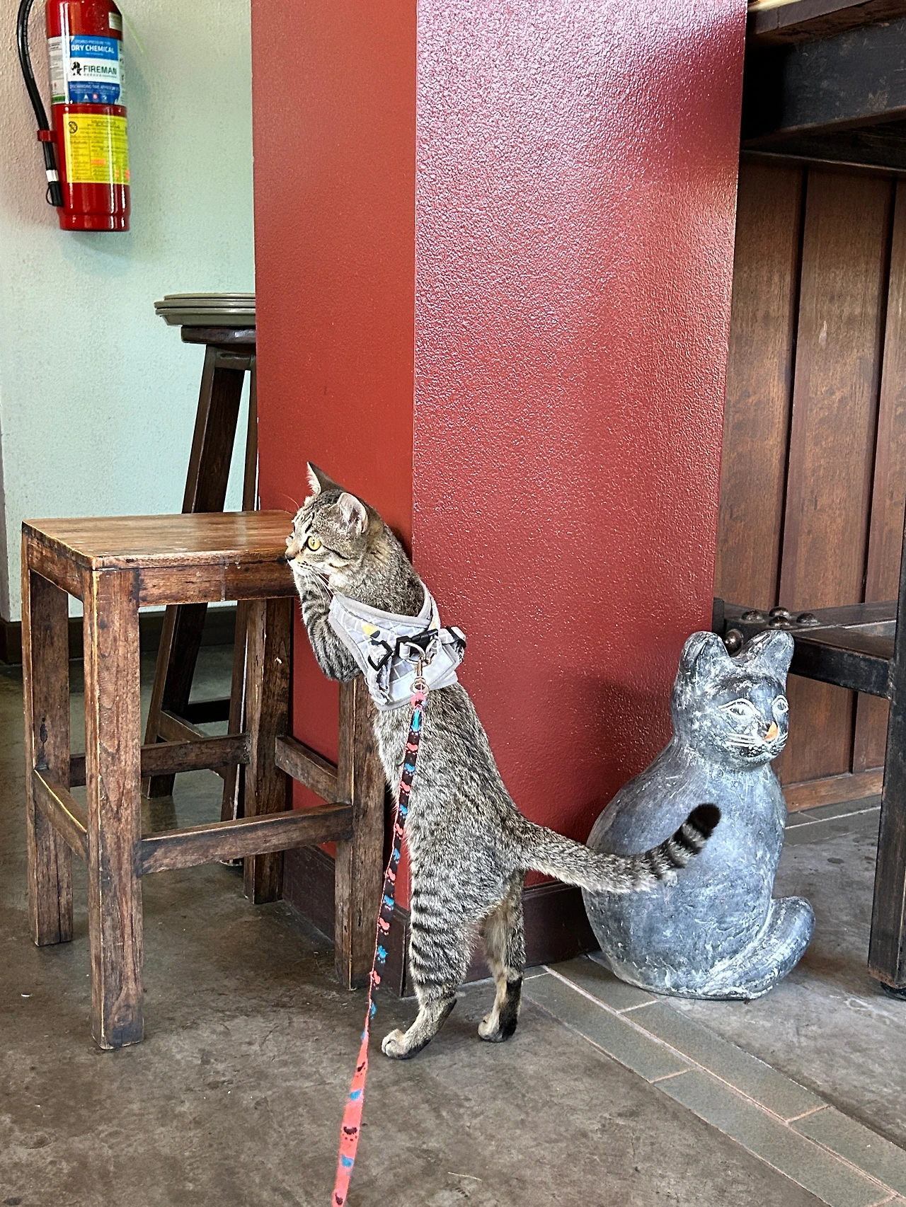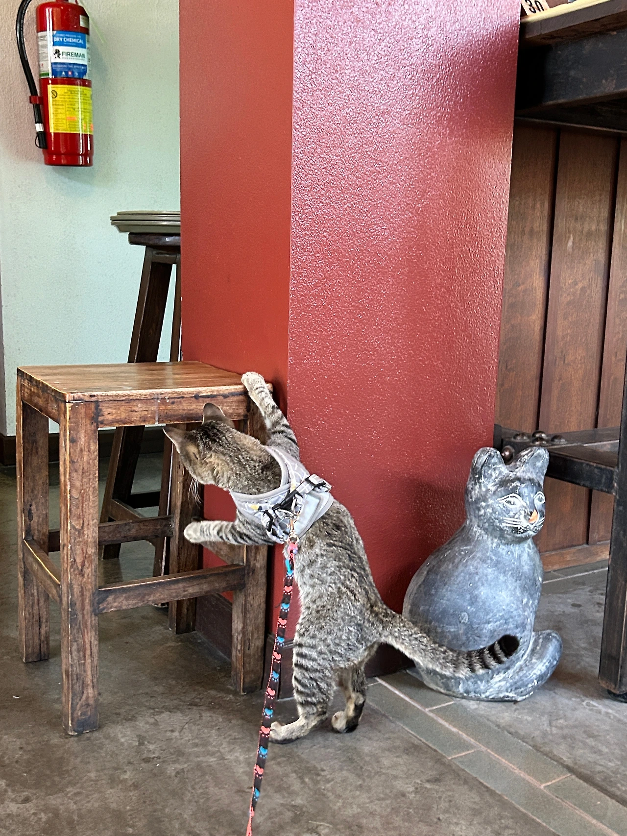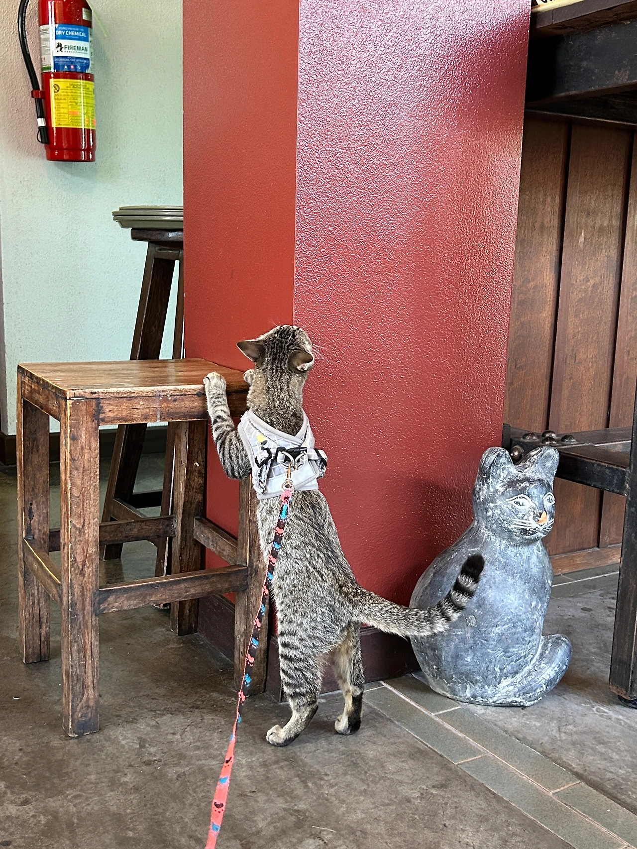 한 살이 채 되지 않아 보이는 어린 고양이는 혹시 사고라도 날까봐 걱정되었는지 하네스를 채워두었고, 어른냥이는 제 맘대로 식당 안을 여기저기 자유롭게 돌아다니는 모양이다.